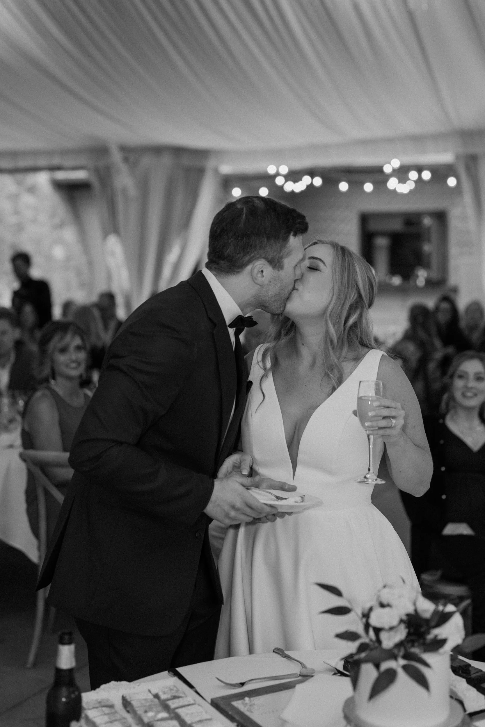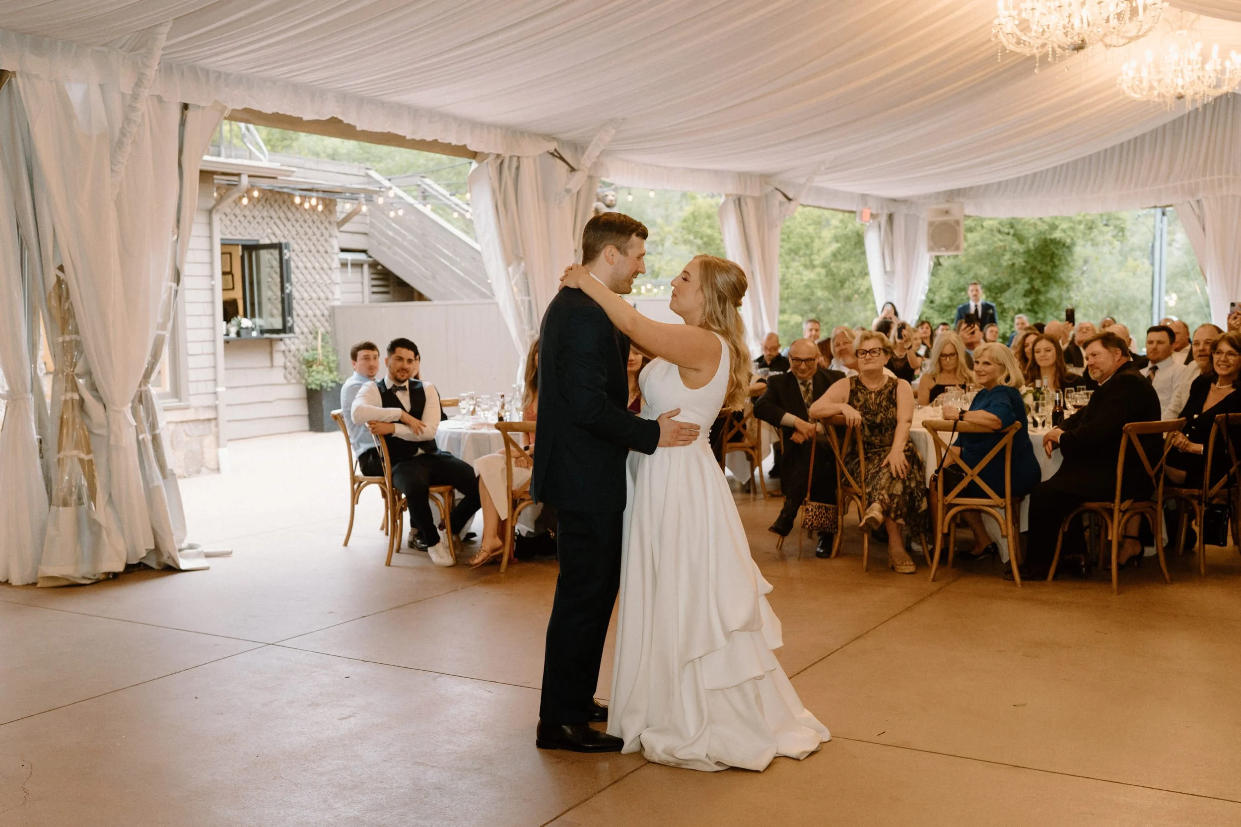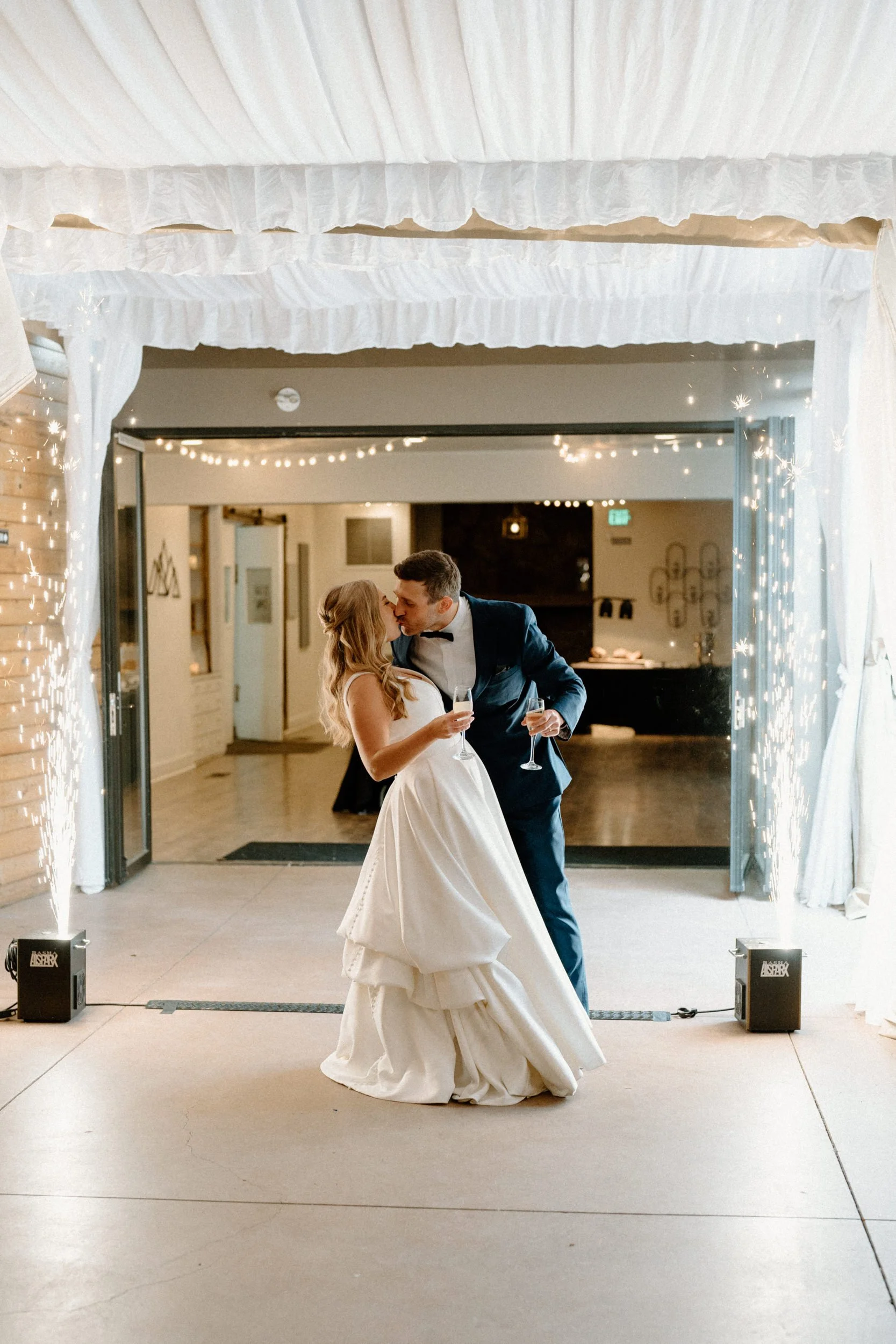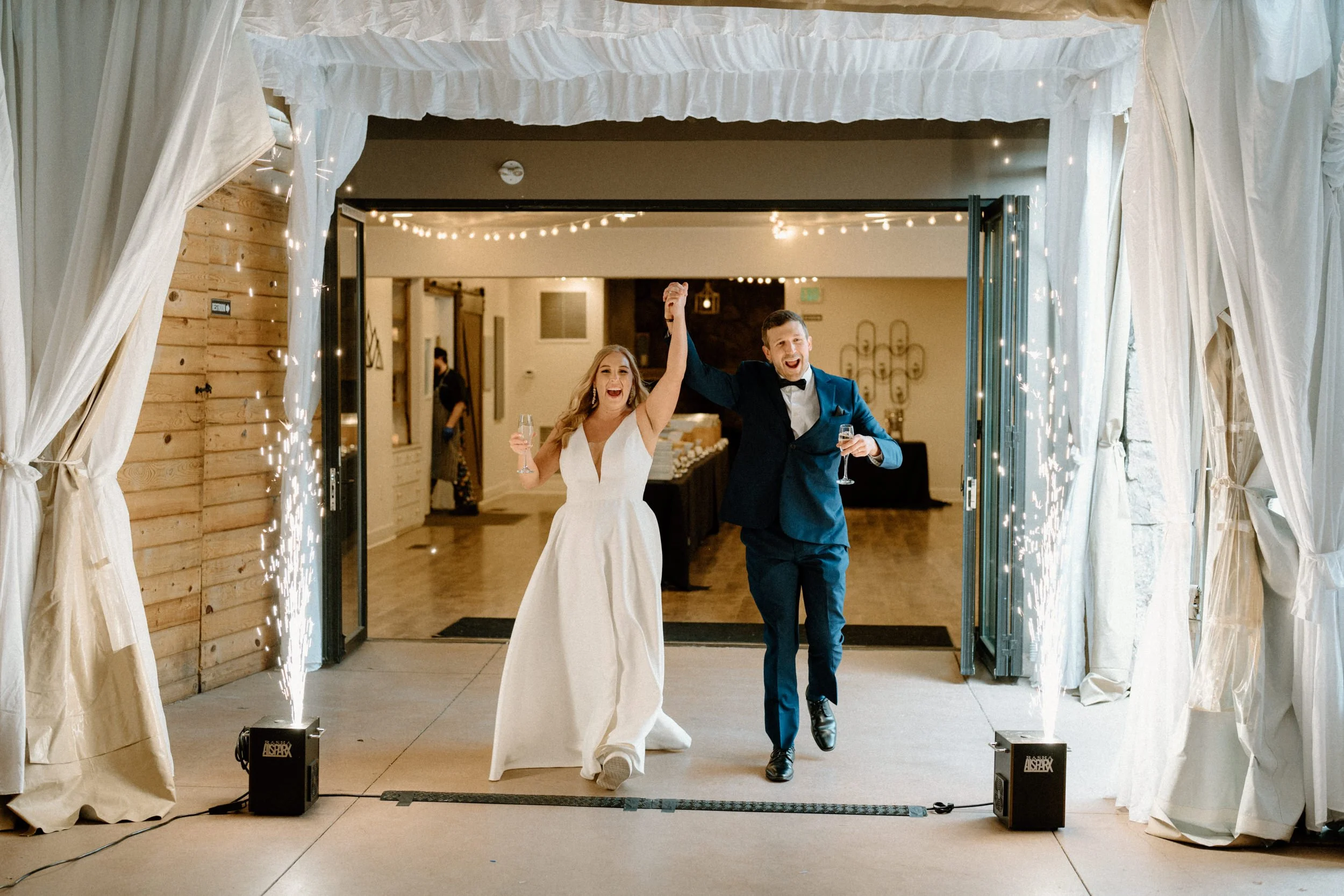 Their wedding was traditional with their own flare, making it perfectly intimate for the bride and groom while also spending quality time with guests. As the night went on, the bride and groom had the most exciting entrance, champagne in hand, to the classic cake-cutting moment. They ended the night with dancing and the room was lit with smiles.