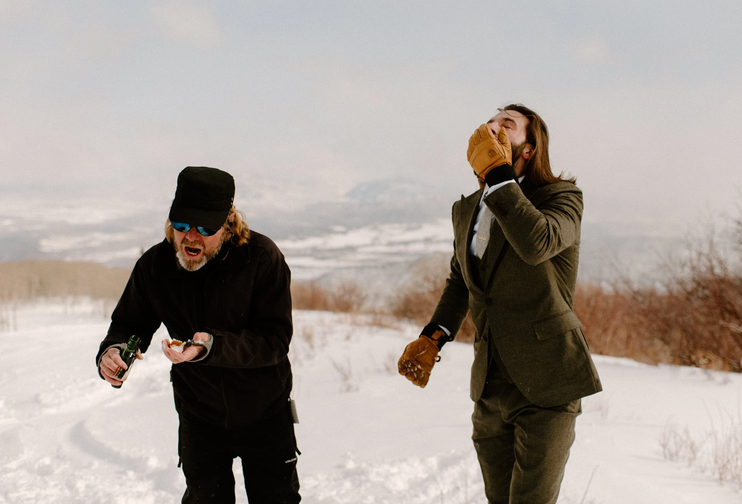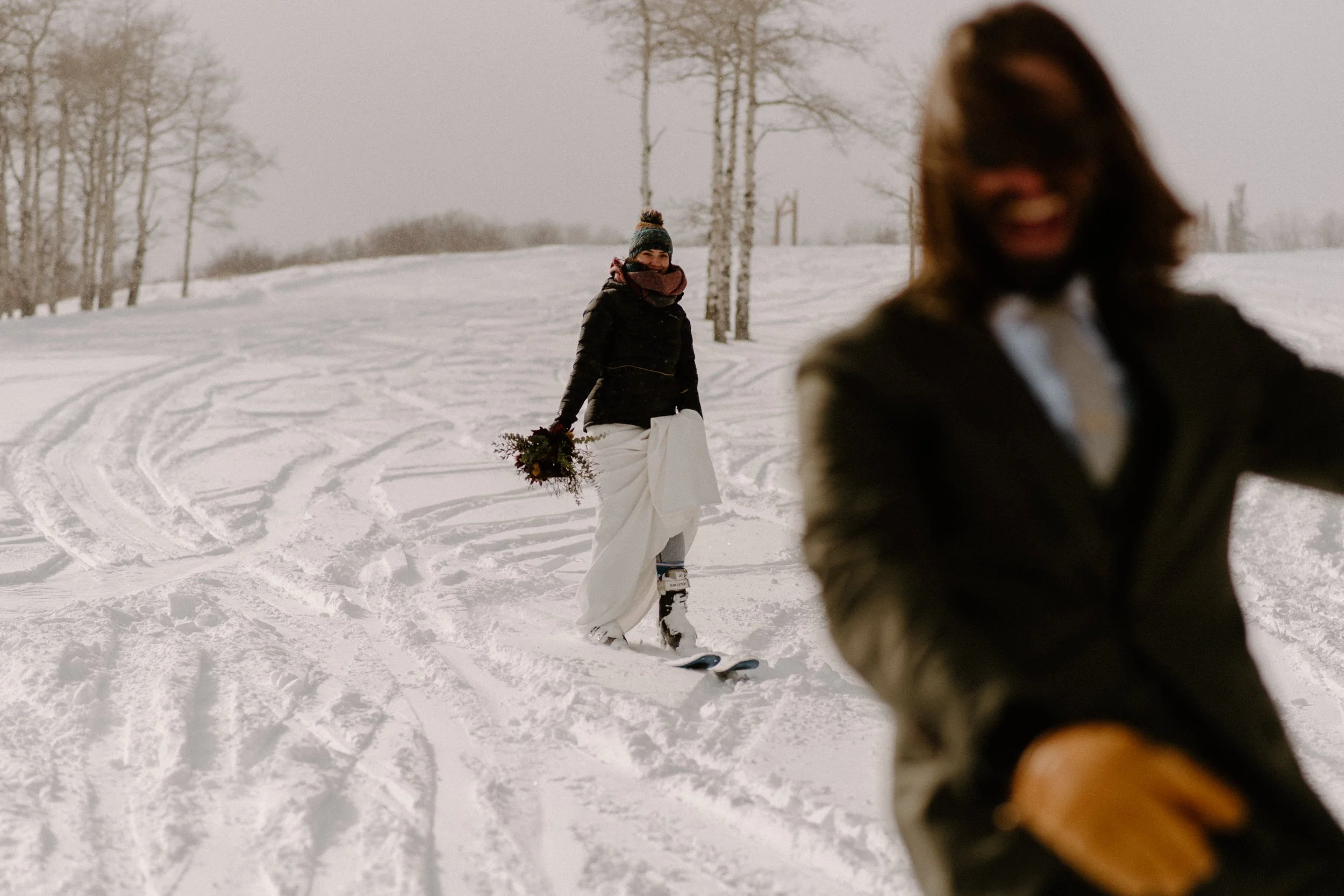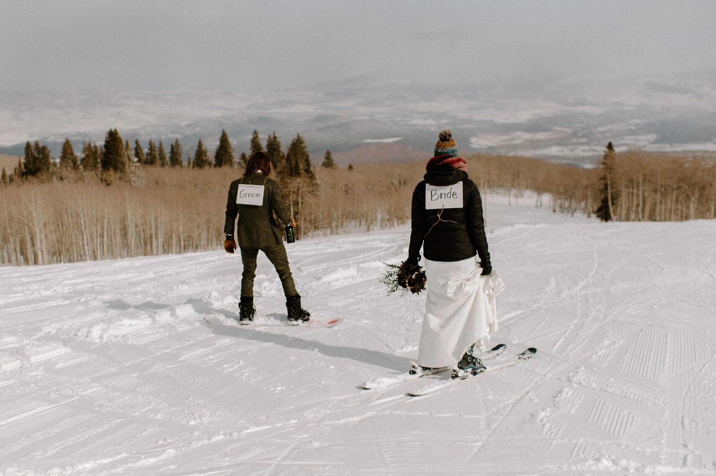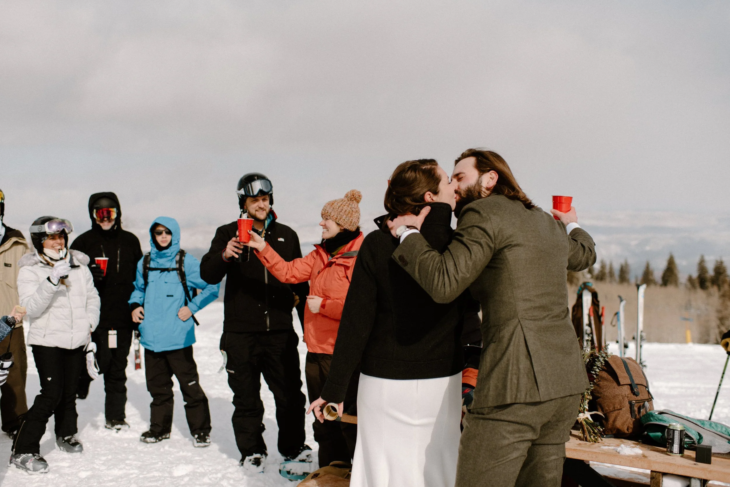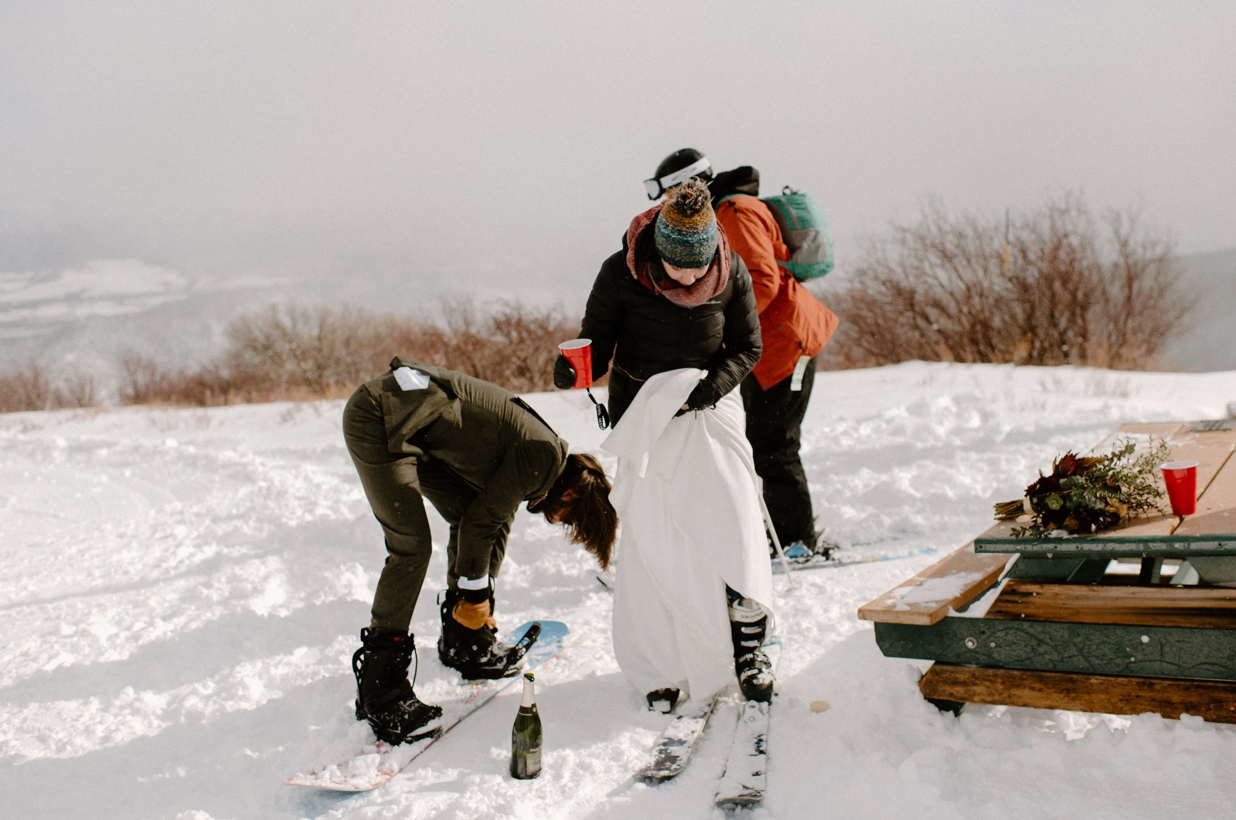 We decided on Sunlight Mountain Resort in Glenwood Springs because it is a local mountain that is much less crowded and touristy than many of the other resorts. We started the day pregaming in the parking lot before getting dressed and taking the lift up the mountain. Once we made it to the top, Brynn skied down the aisle in her dress and we had their ceremony (followed by a champagne toast) - just the two of them, their officiant, and a bunch of local skiers who decided to join! It was such a blast.