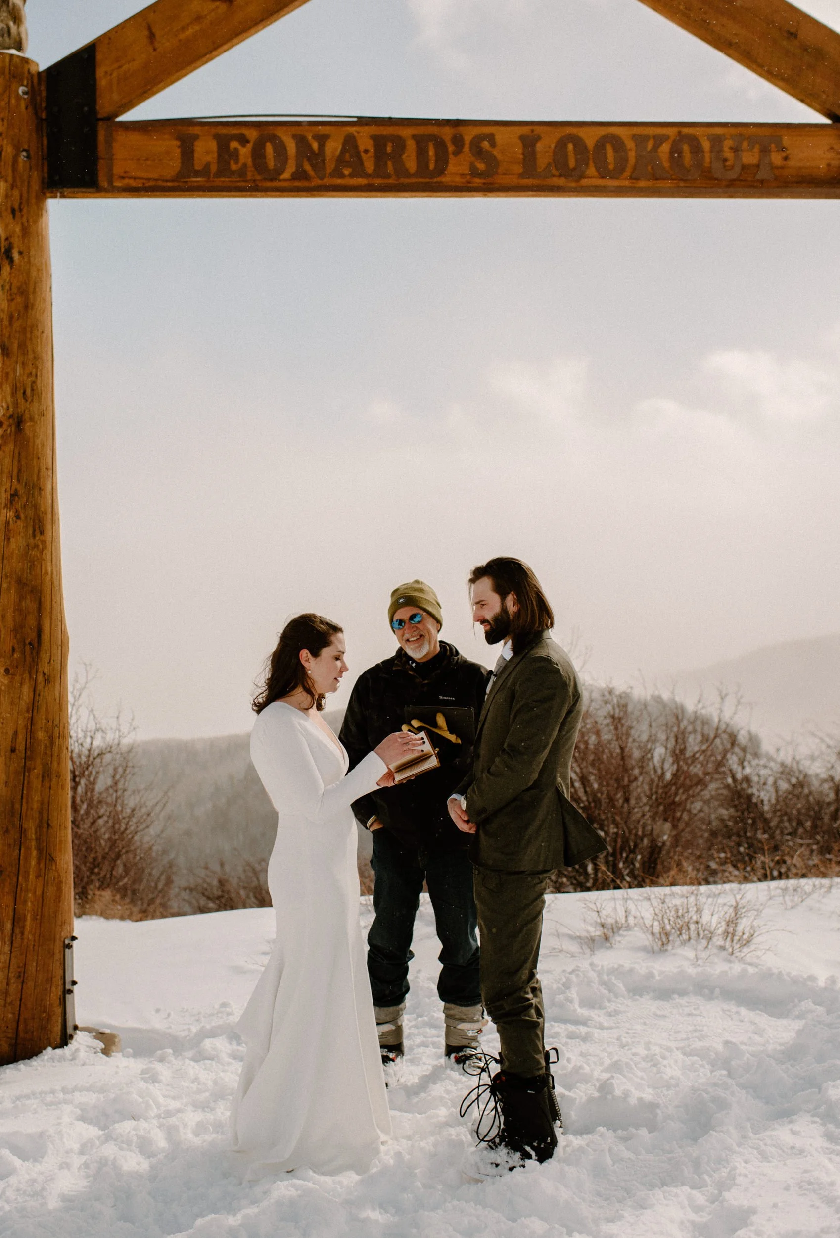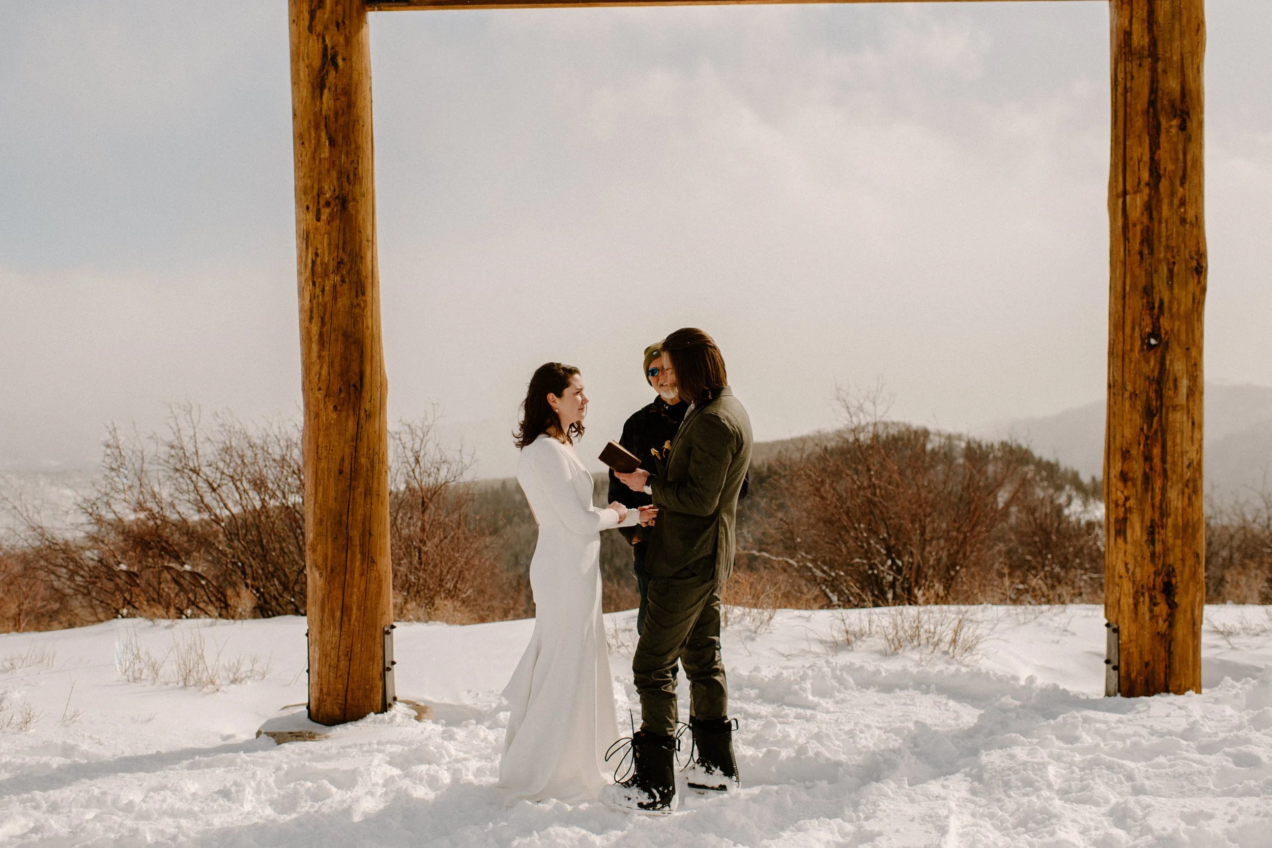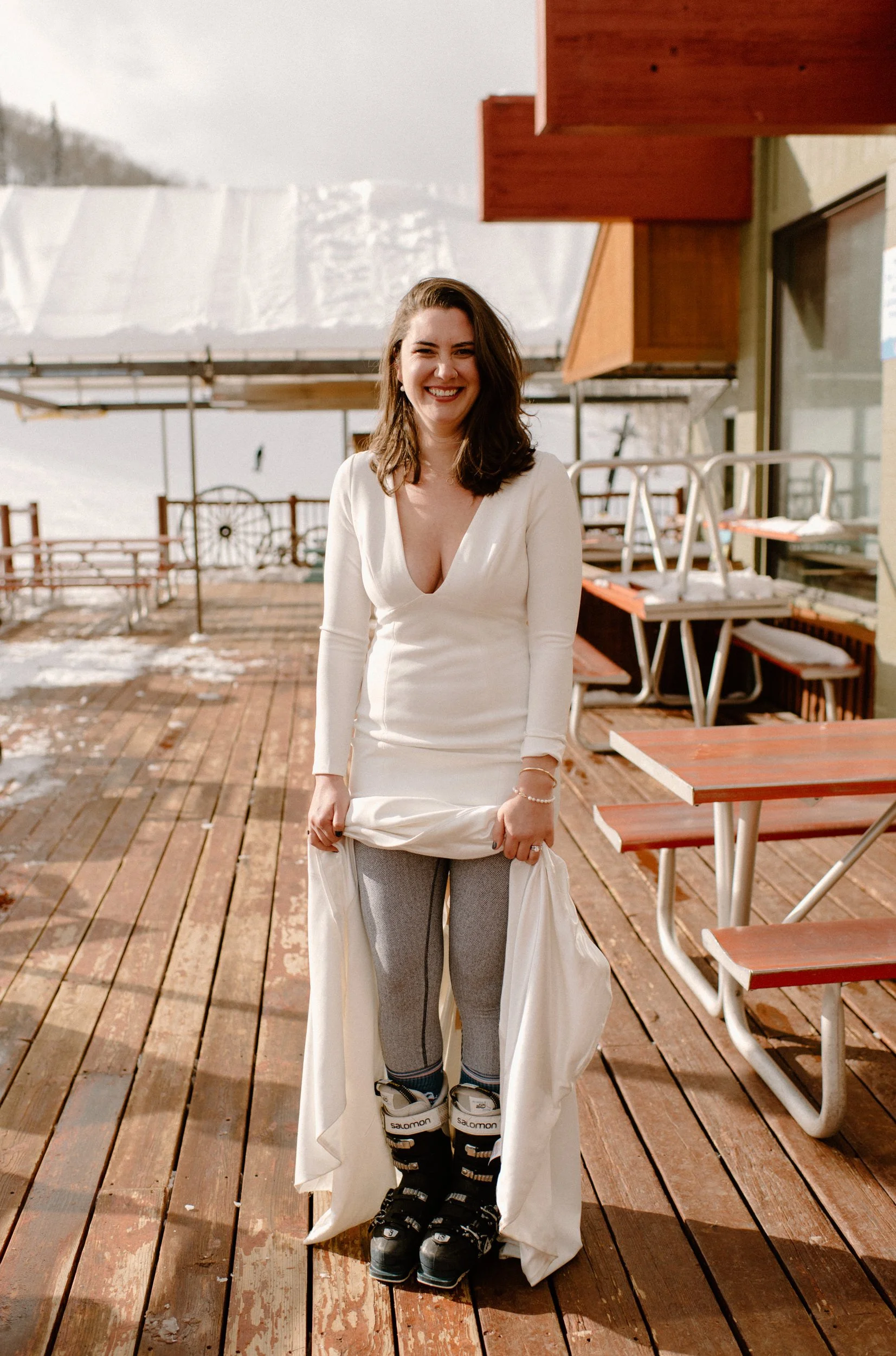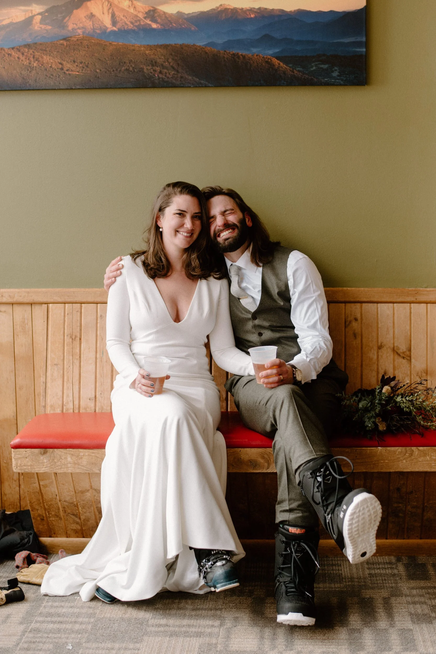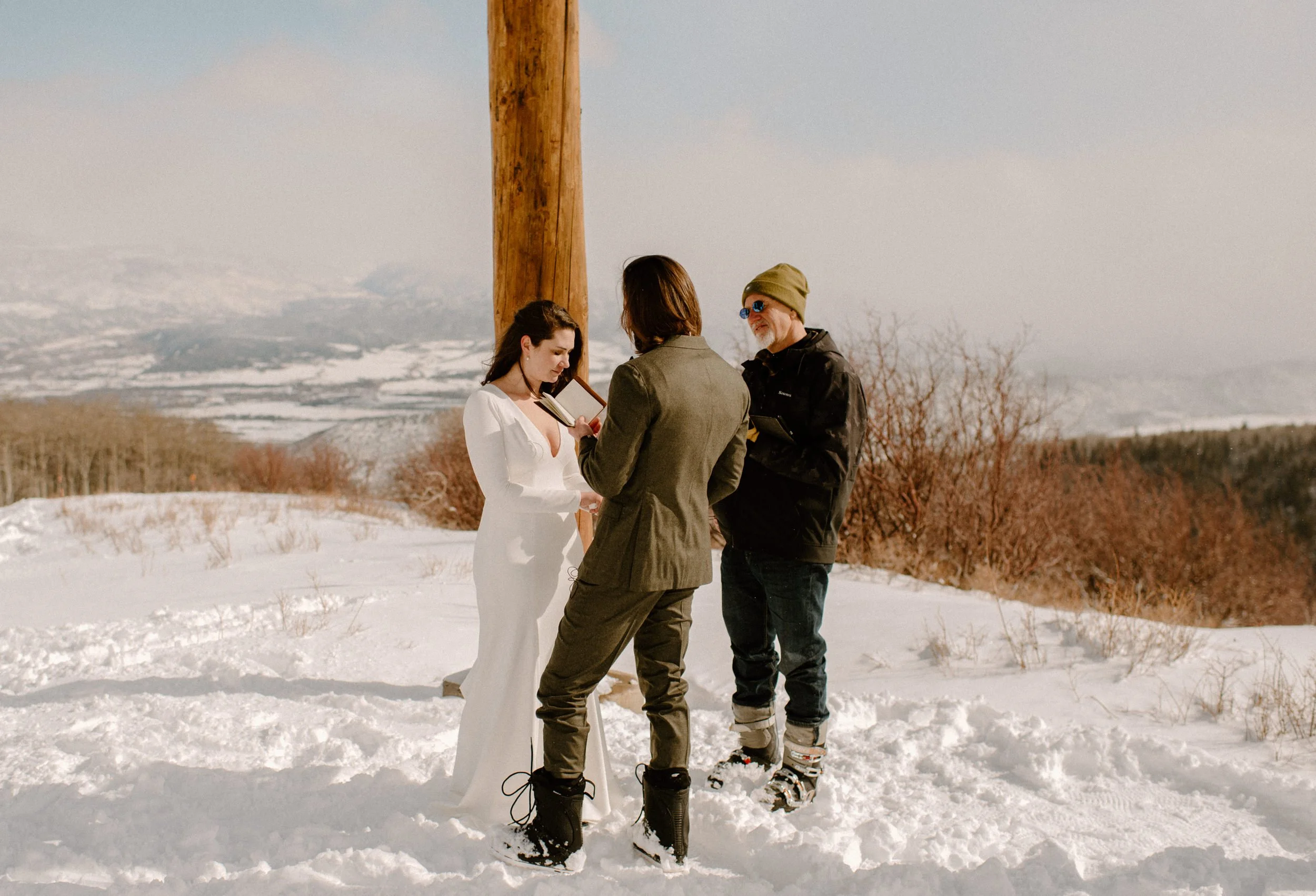 We decided on Sunlight Mountain Resort in Glenwood Springs because it is a local mountain that is much less crowded and touristy than many of the other resorts. We started the day pregaming in the parking lot before getting dressed and taking the lift up the mountain. Once we made it to the top, Brynn skied down the aisle in her dress and we had their ceremony (followed by a champagne toast) – just the two of them, their officiant, and a bunch of local skiers who decided to join! It was such a blast.