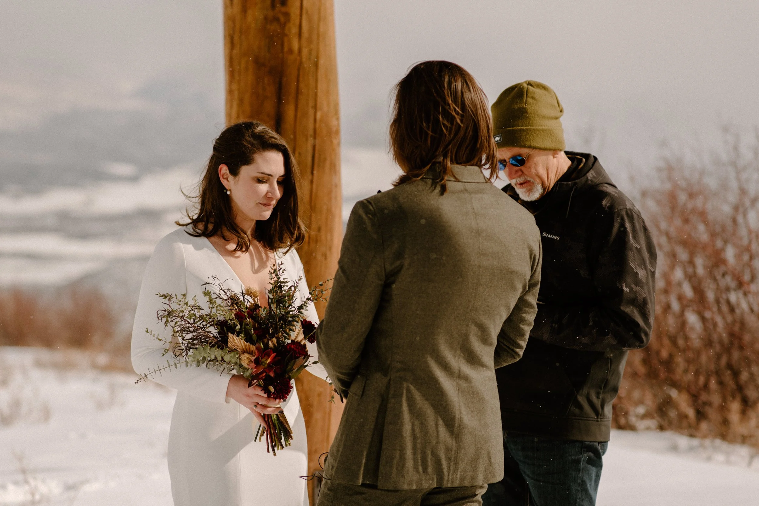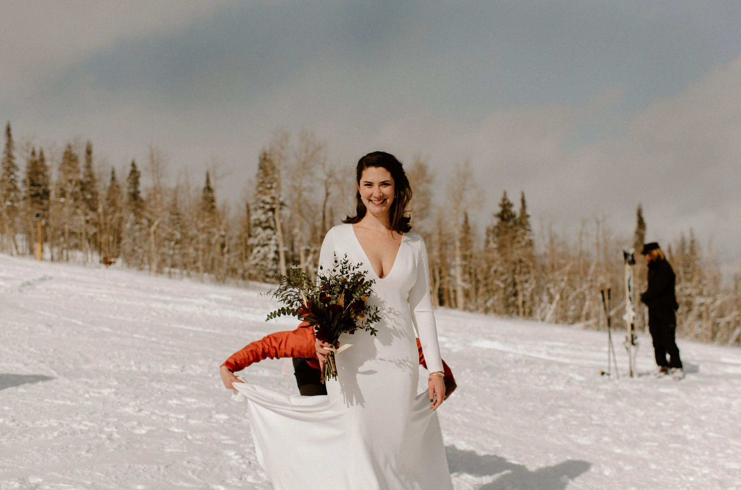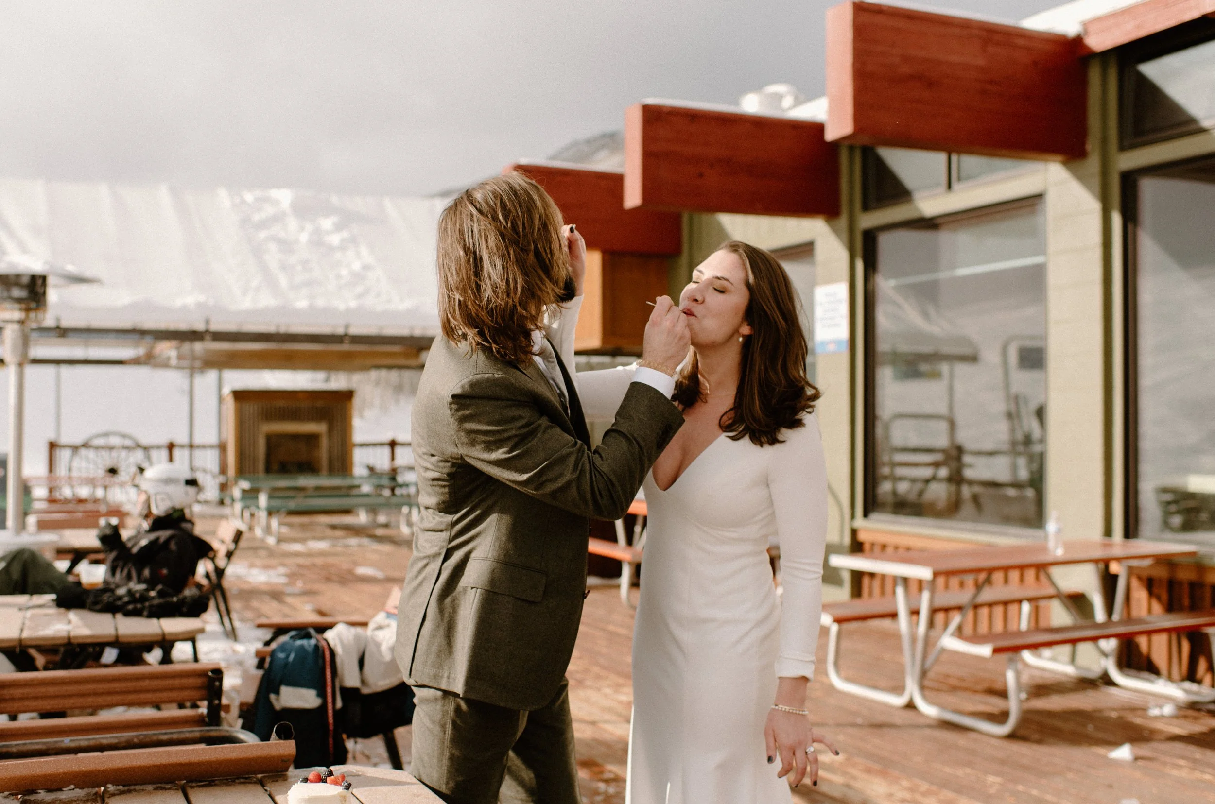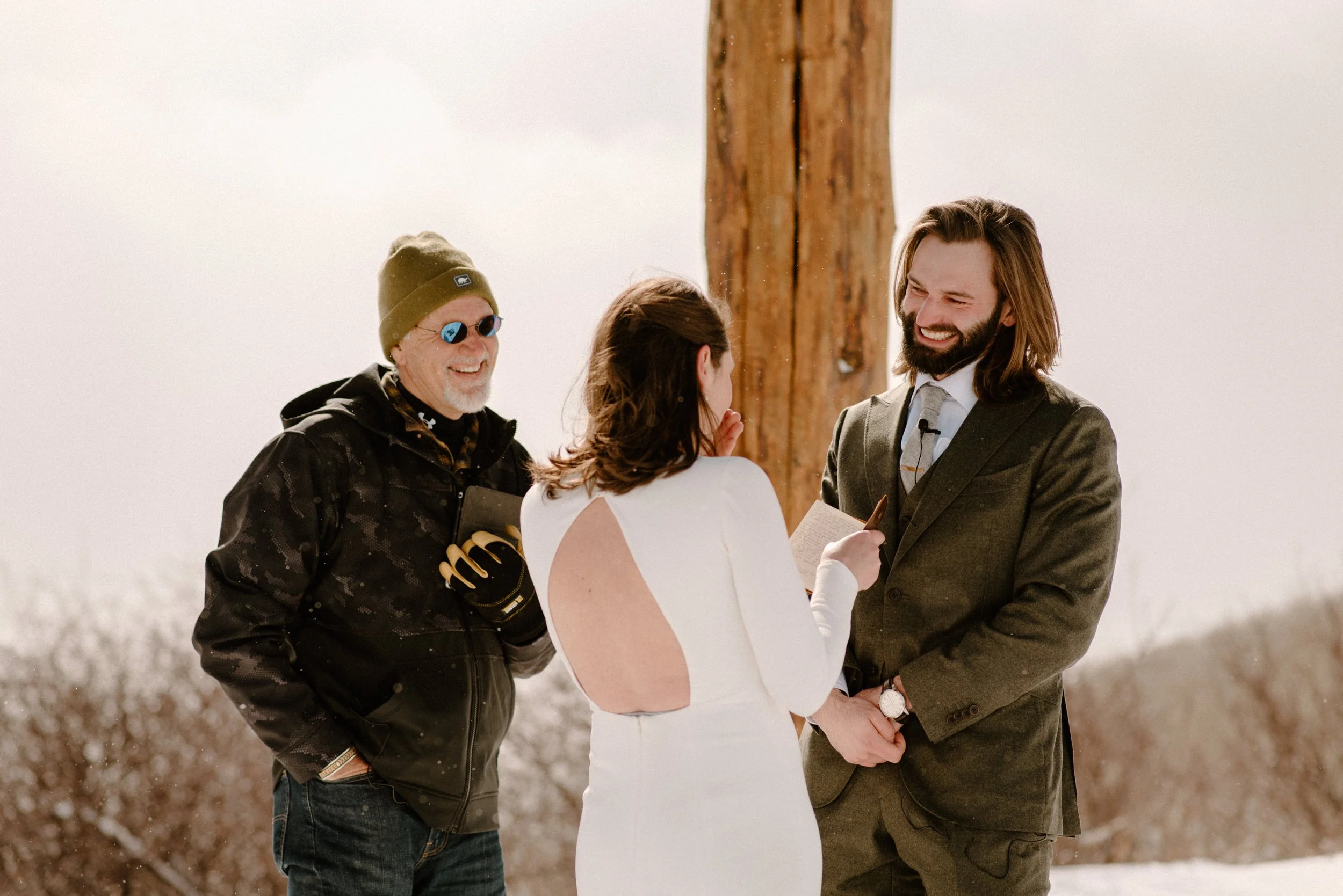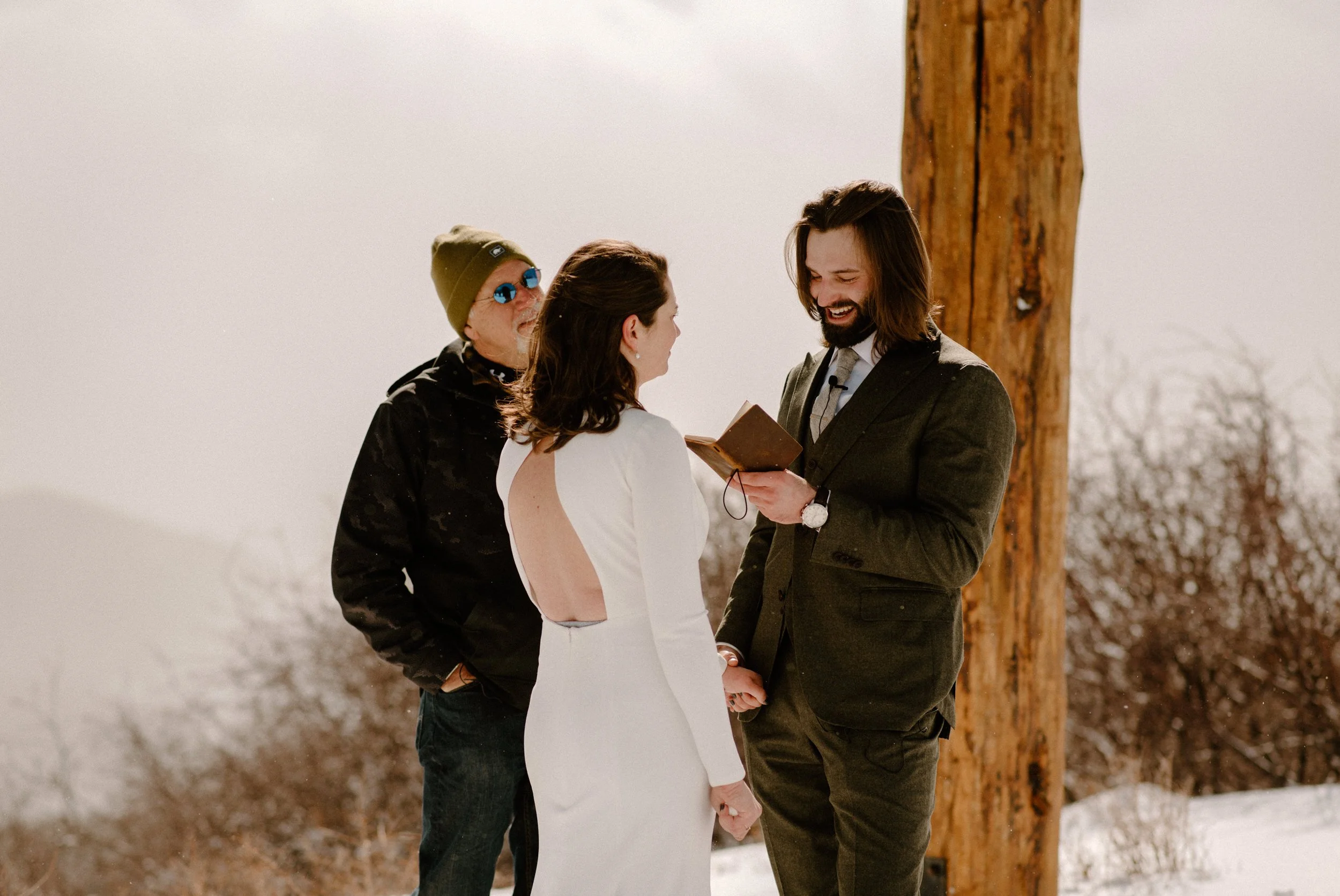 We decided on Sunlight Mountain Resort in Glenwood Springs because it is a local mountain that is much less crowded and touristy than many of the other resorts. We started the day pregaming in the parking lot before getting dressed and taking the lift up the mountain. Once we made it to the top, Brynn skied down the aisle in her dress and we had their ceremony (followed by a champagne toast) – just the two of them, their officiant, and a bunch of local skiers who decided to join! It was such a blast.
