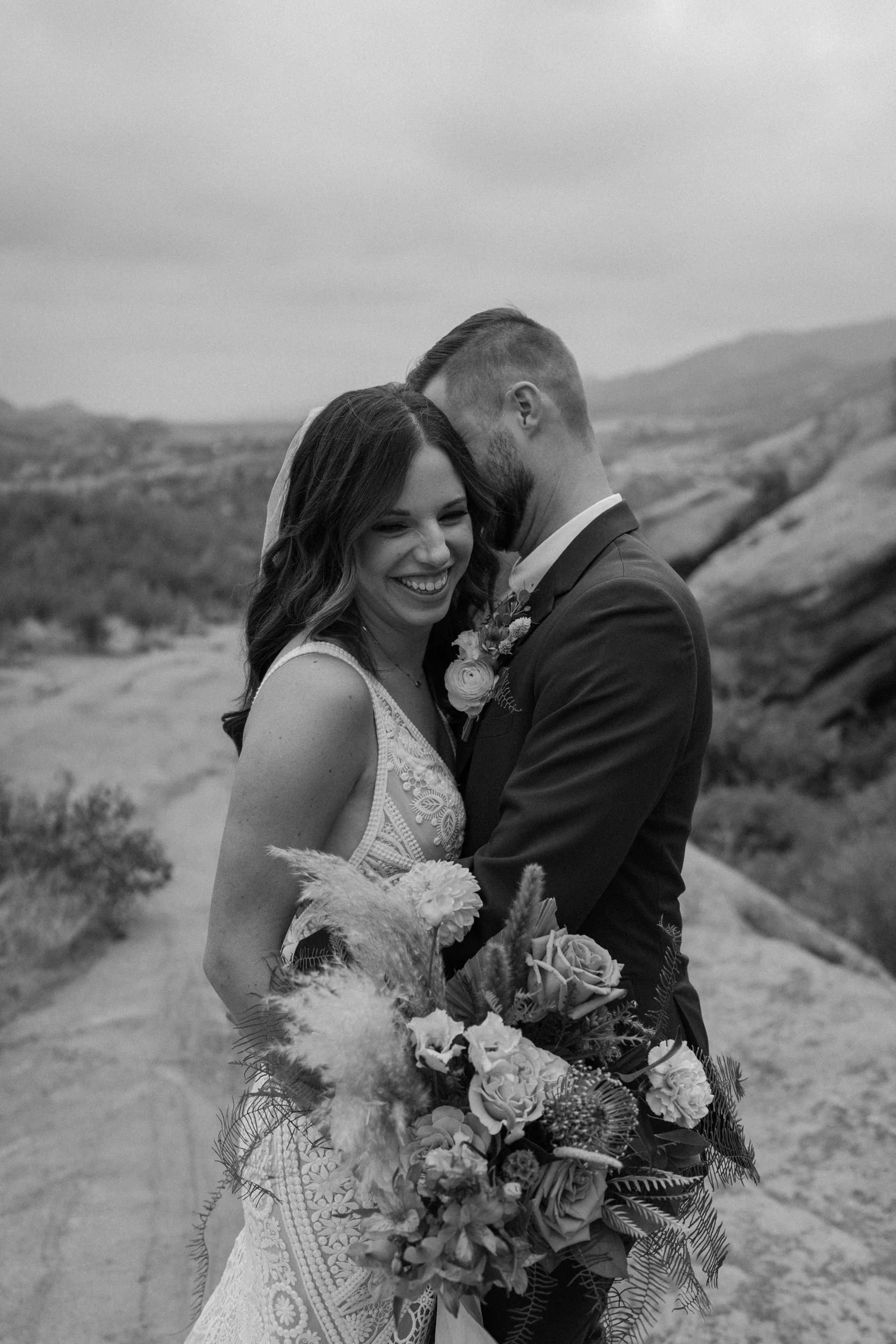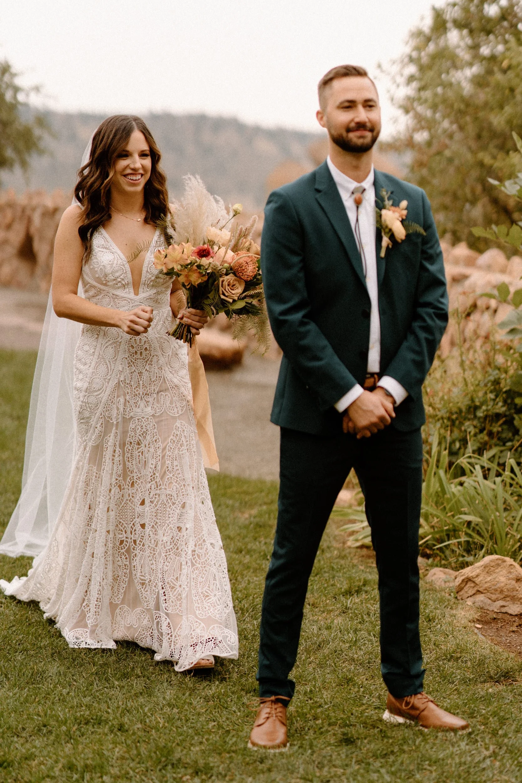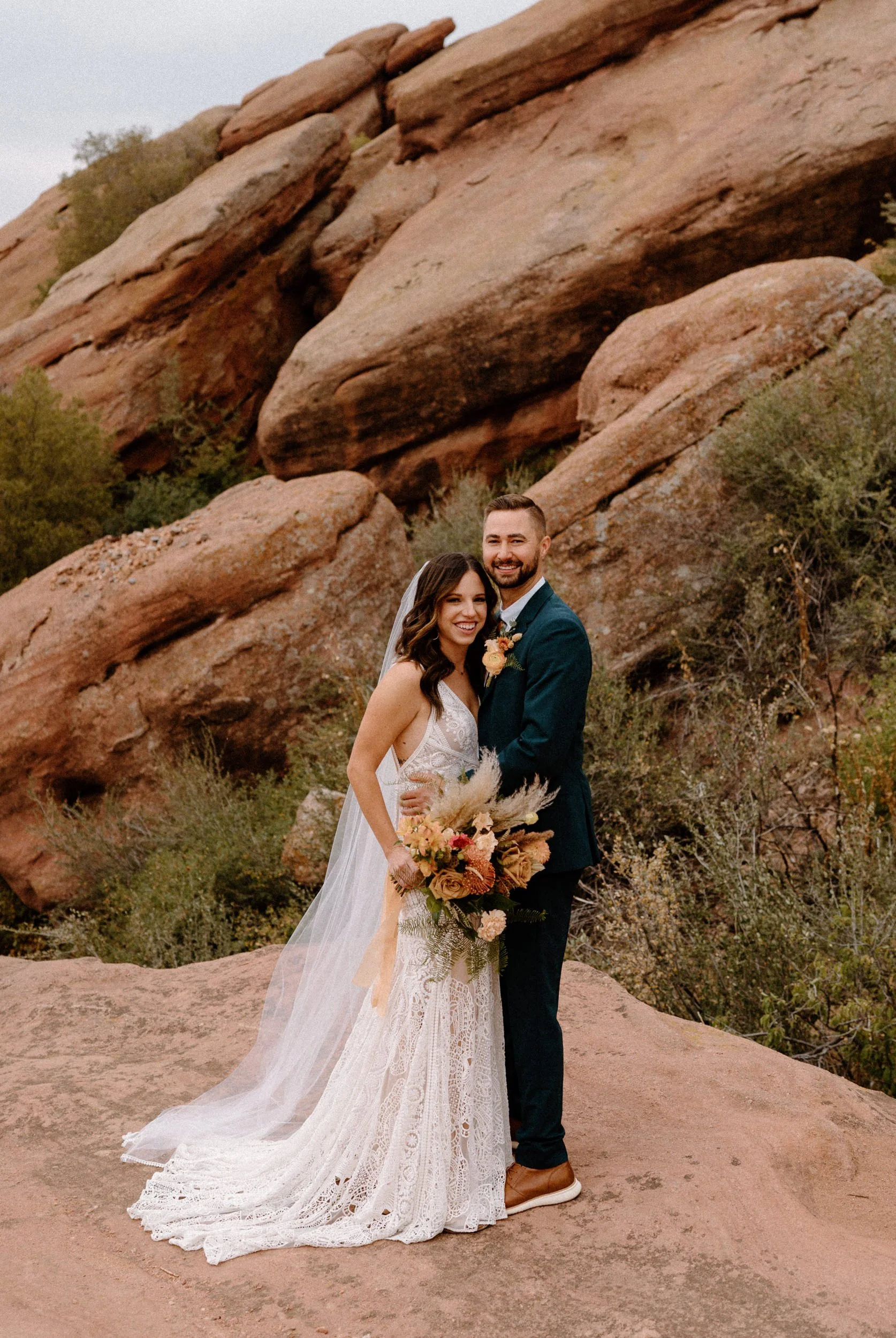 The ceremony took place at the iconic Red Rocks Trading Post, framed by sweeping views and those signature red sandstone formations. Katie wore a dreamy lace gown from A&Be Bridal Shop, and it was the perfect mix of modern boho and elegance.