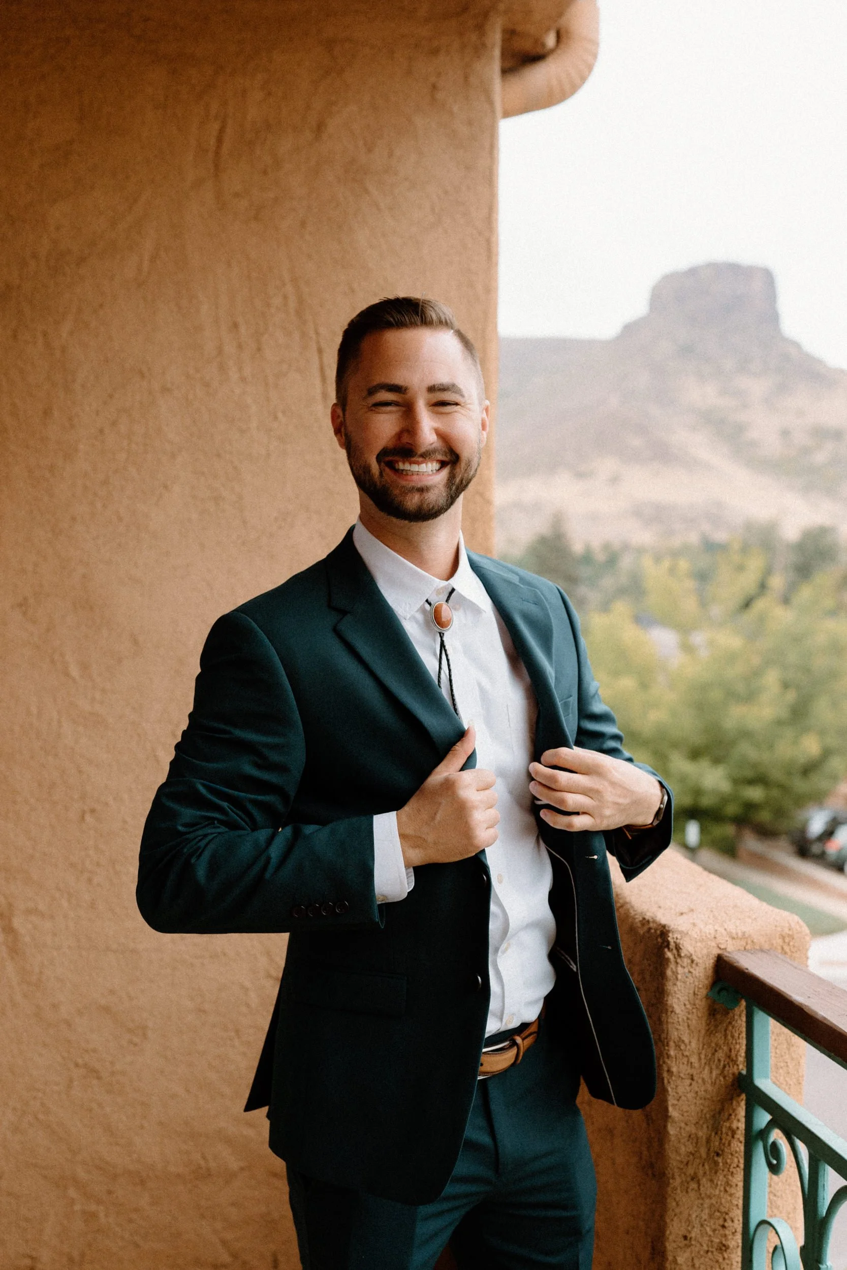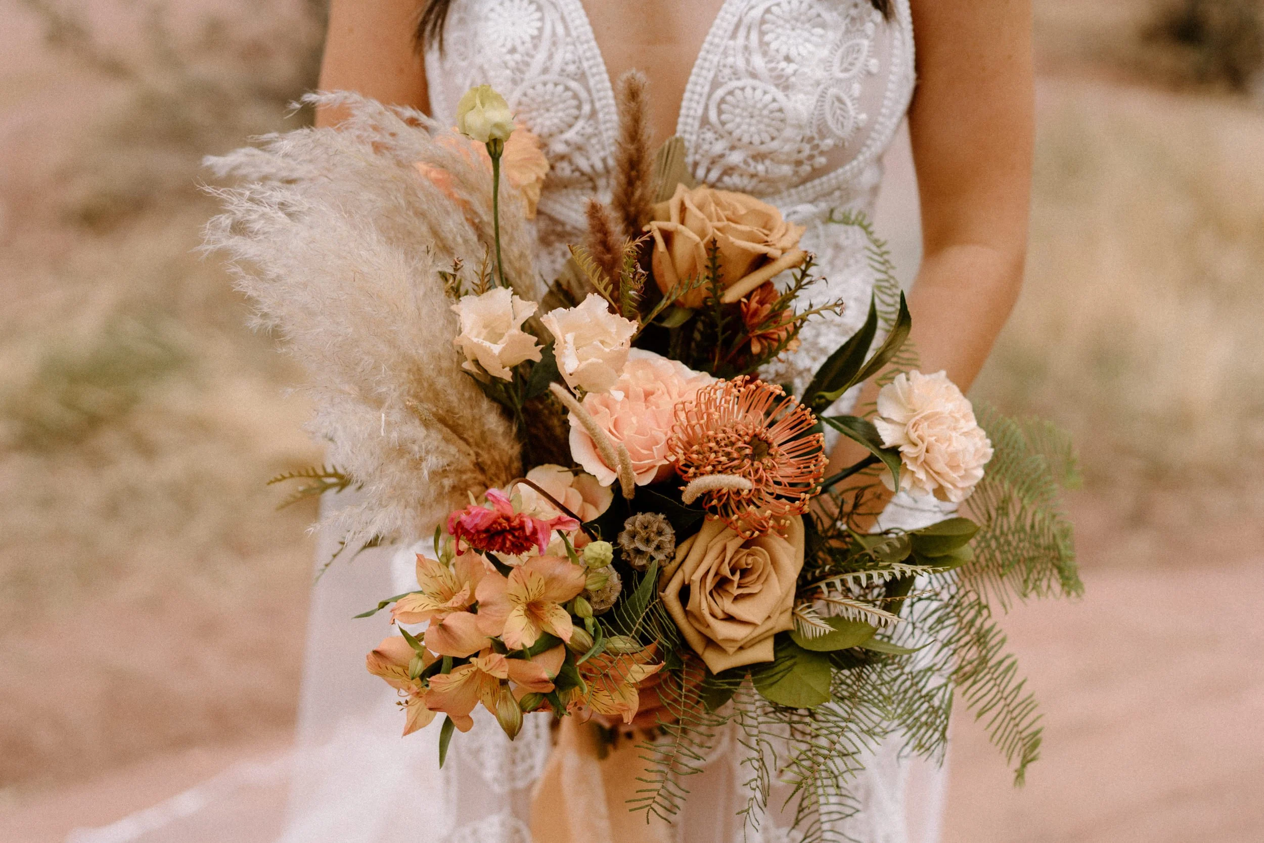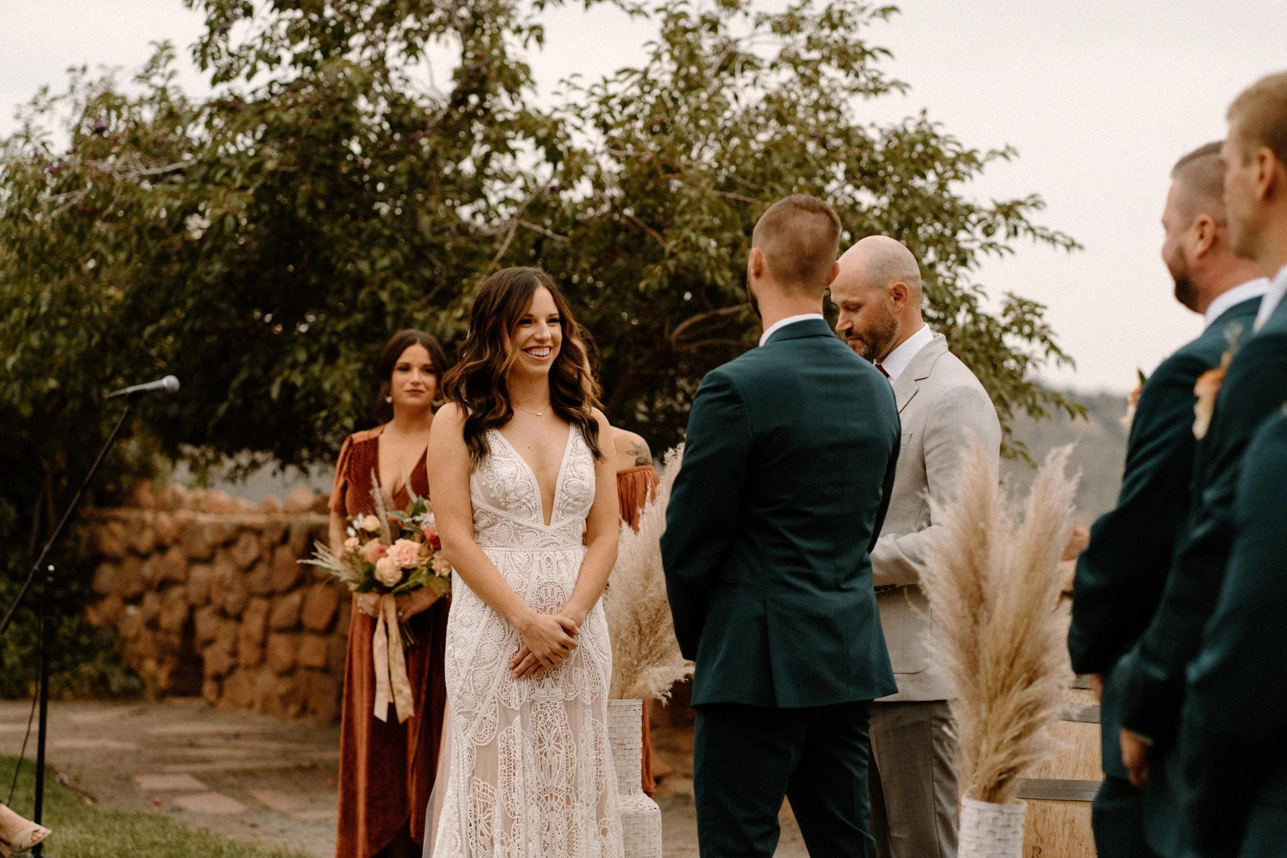 The ceremony took place at the iconic Red Rocks Trading Post, framed by sweeping views and those signature red sandstone formations. Katie wore a dreamy lace gown from A&Be Bridal Shop, and it was the perfect mix of modern boho and elegance.