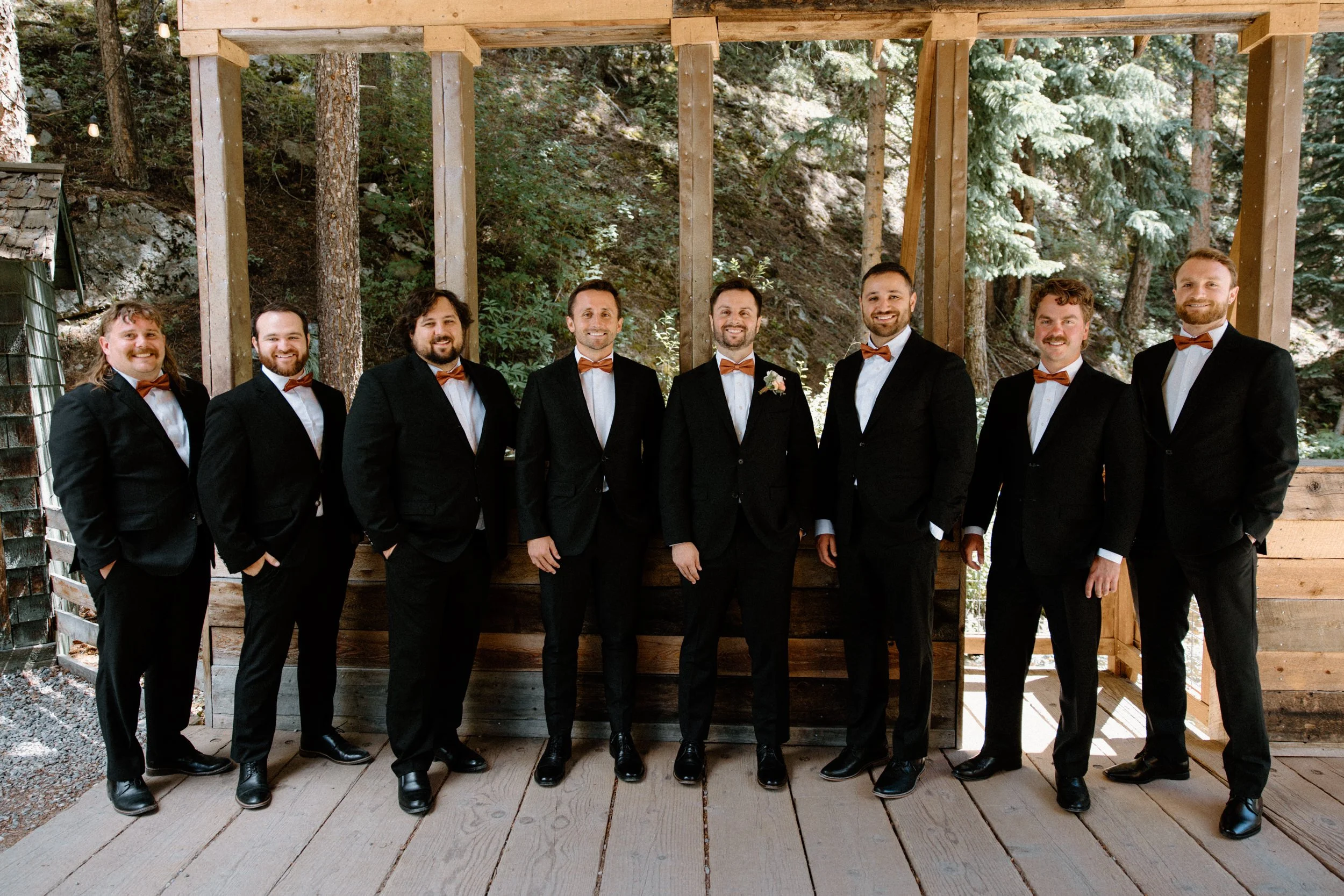 The forest ceremony spot? Unreal. Towering pines, golden light filtering through the trees, and a geometric arch dripping in florals, it was like stepping into a fairytale. Kiley looked stunning in her strapless gown, and Chad’s reaction when he saw her? Let’s just say I teared up behind the lens. Their wedding party brought the energy, with bridesmaids in soft peach and pink tones and groomsmen rocking classic black suits. The vibe was joyful, relaxed, and full of love.