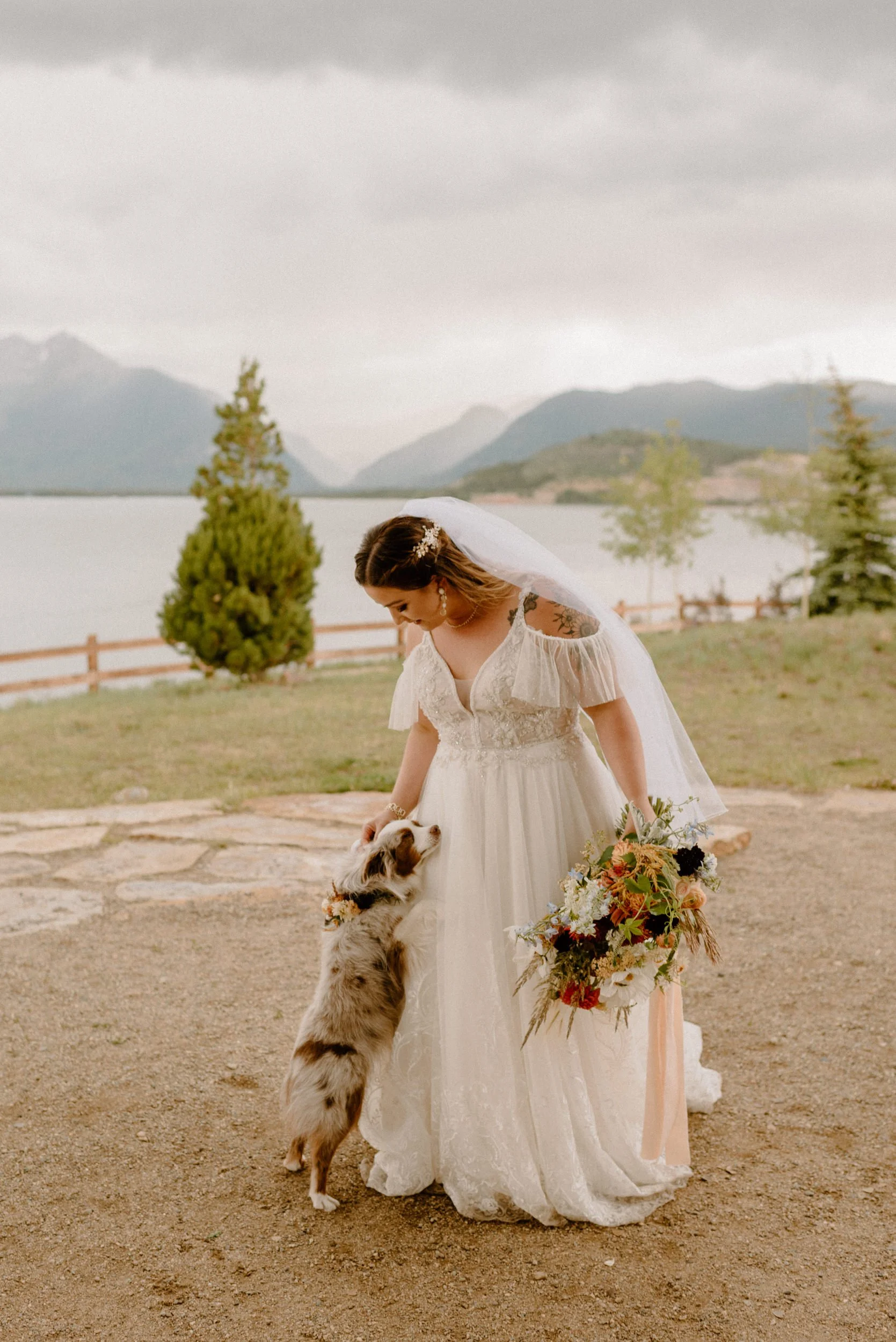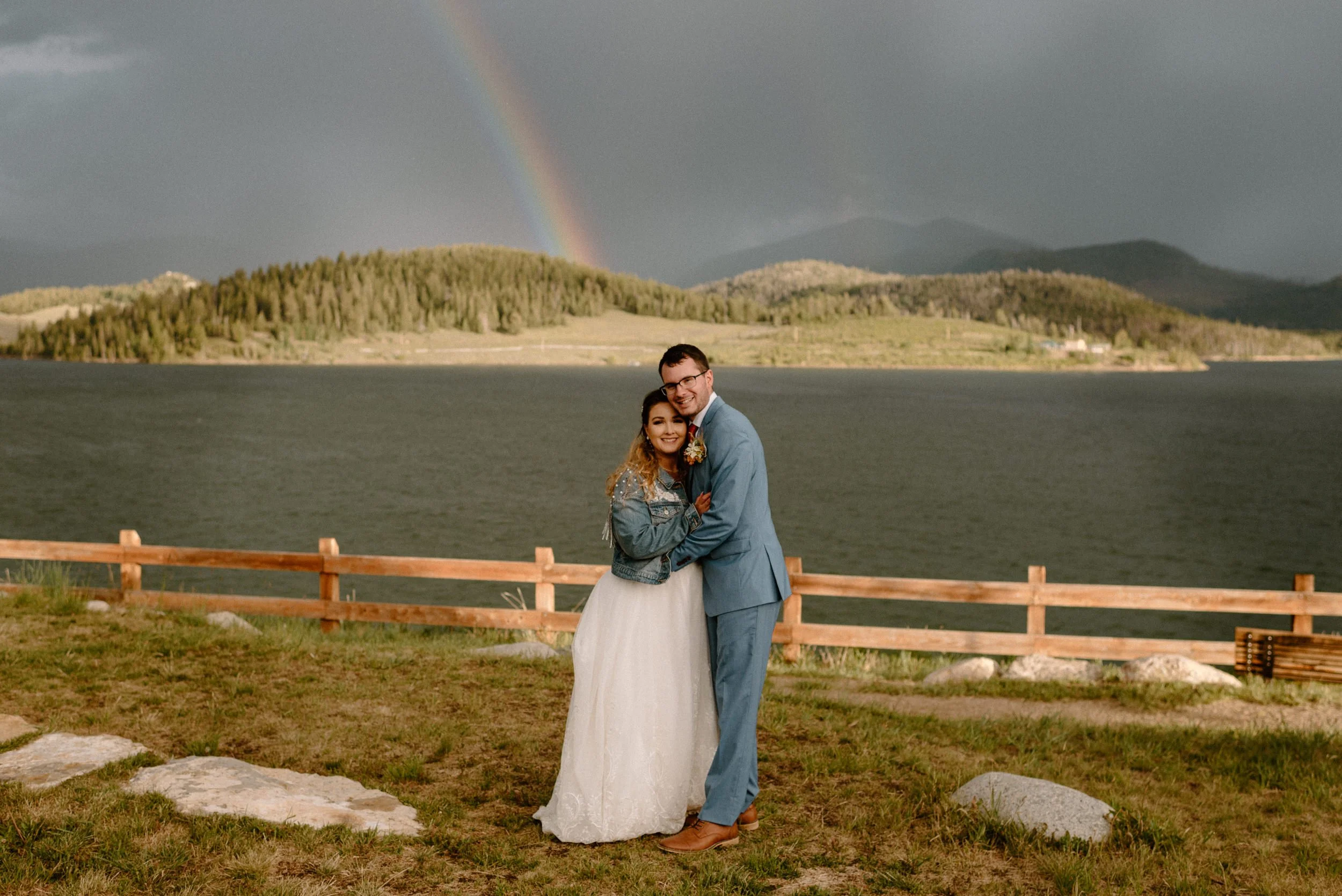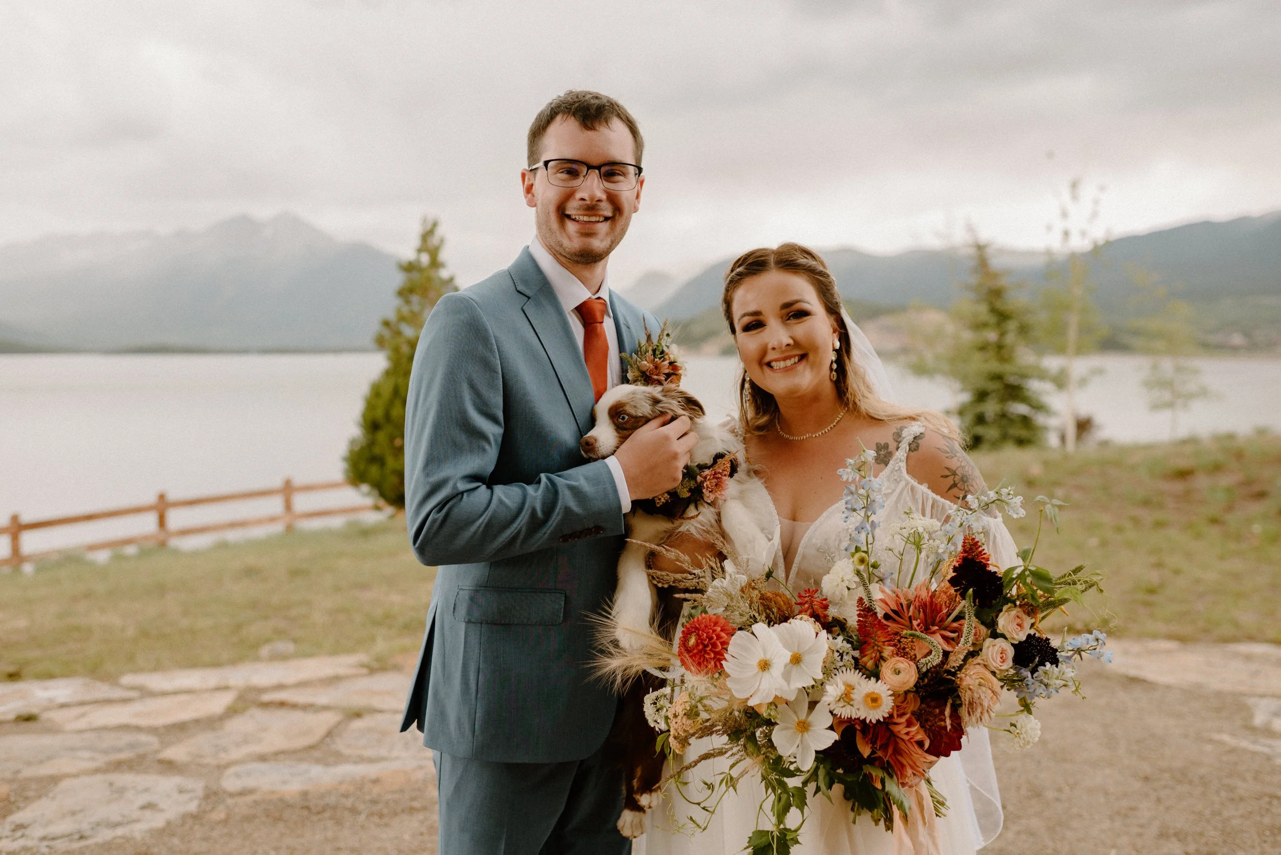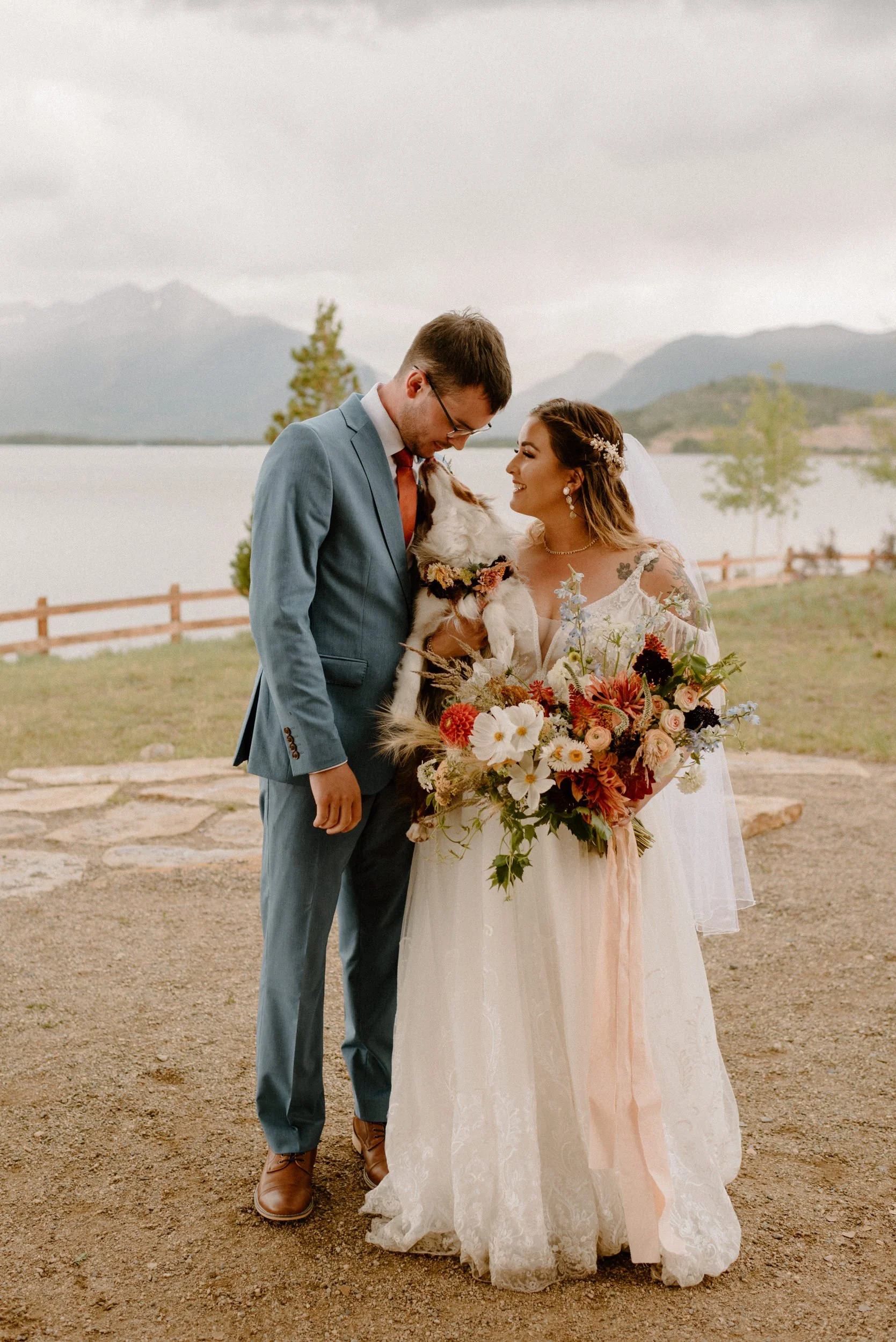We started the day getting ready at their Airbnb in Breckenridge, followed by the sweetest first look ever up on Loveland Pass. It was freezing up there, but we got the most amazing clouds and fog! It was so pretty! After we finished up at the summit, we spent the rest of the afternoon adventuring around Lake Dillon taking photos. It was so much fun! We finally ended up at Marina Park for the ceremony and spent the afternoon mingling and celebrating. Their cute pup Nash even interrupted the ceremony for belly rubs which was the sweetest thing ever! Their reception was full of so much love, laughter, and even ended with the most stunning double rainbow I’ve ever seen!