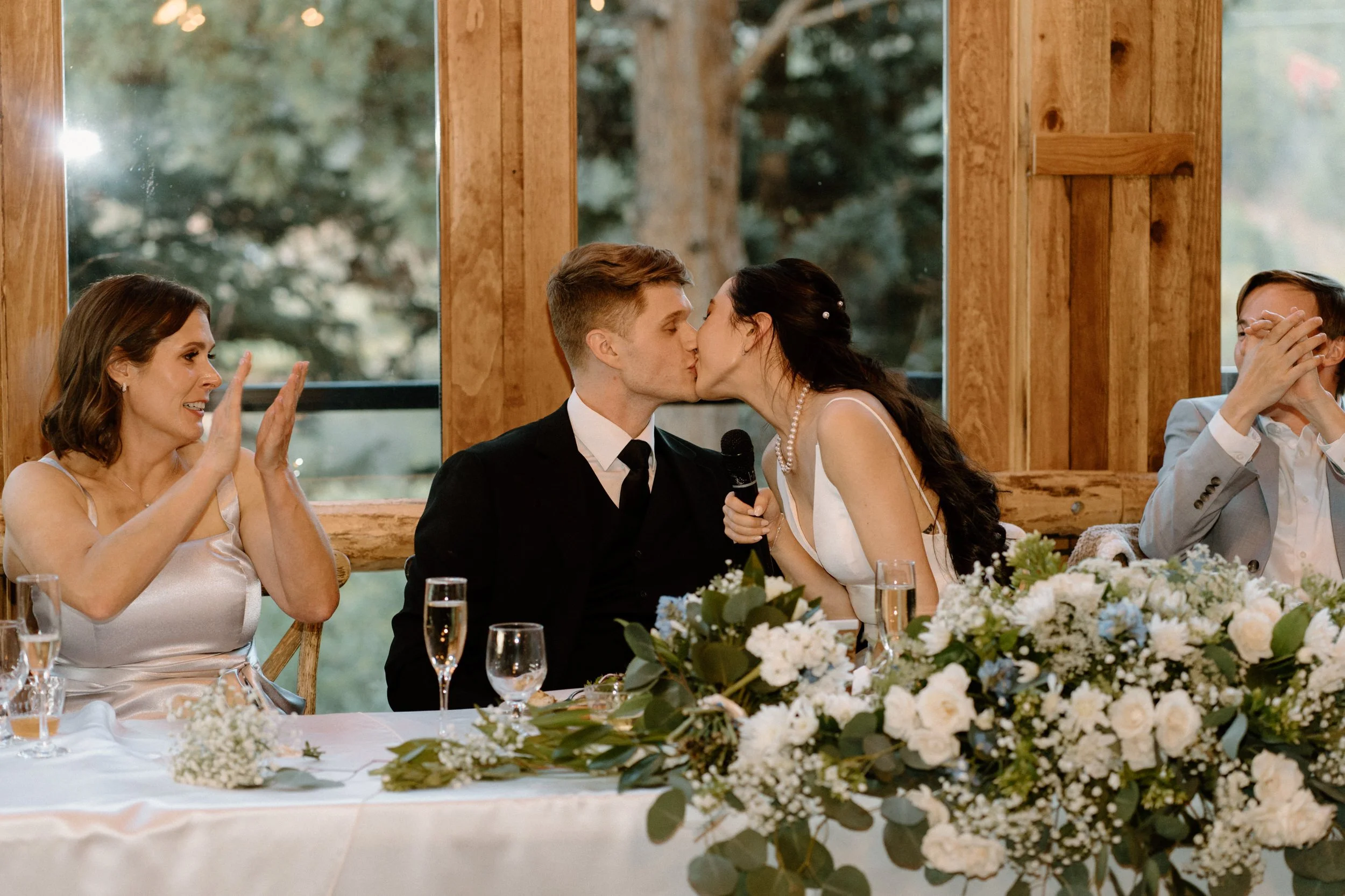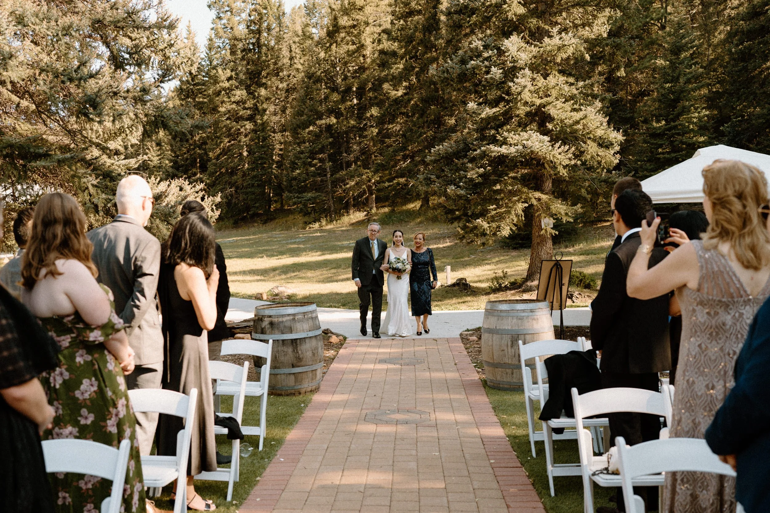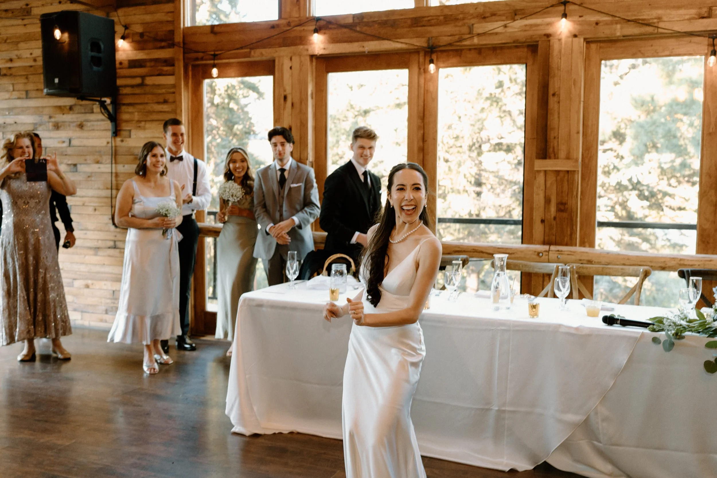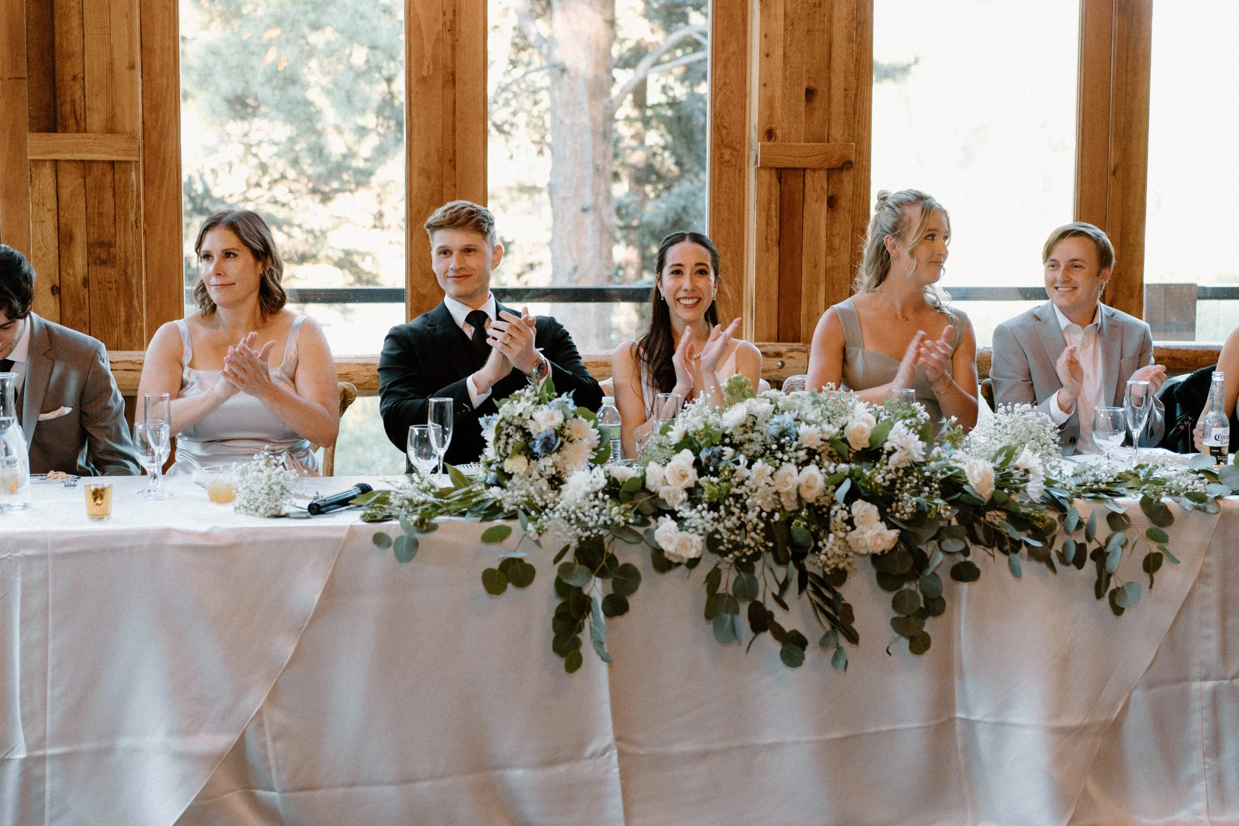 The ceremony took place surrounded by tall pines and mountain peaks, creating a stunning backdrop as Rachel and Gavin promised forever. There was a peacefulness to it all, the kind of wedding where you could feel how deeply connected everyone was. Every part of the day held meaning, from the custom signage to the florals that tied in their favorite colors and memories.