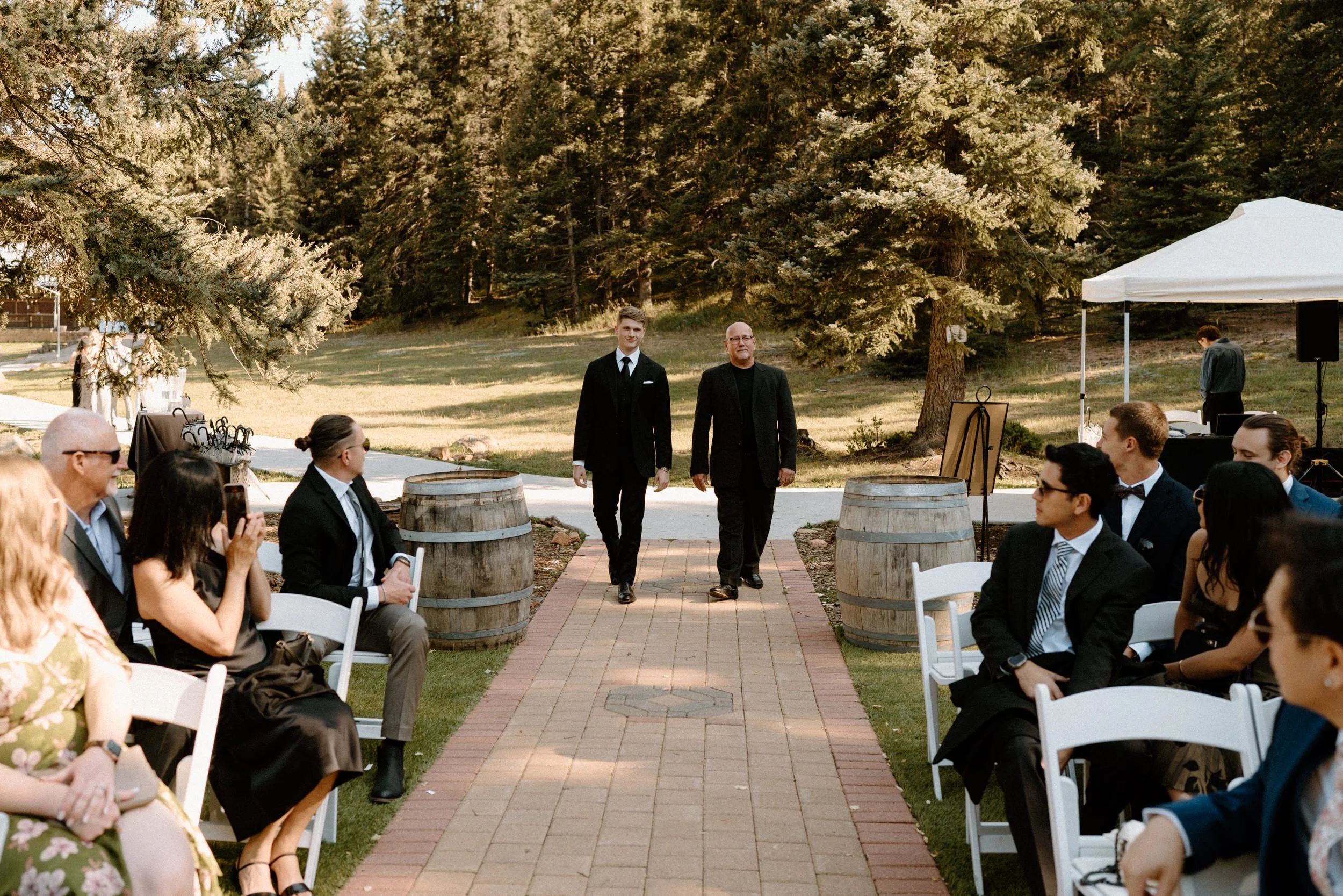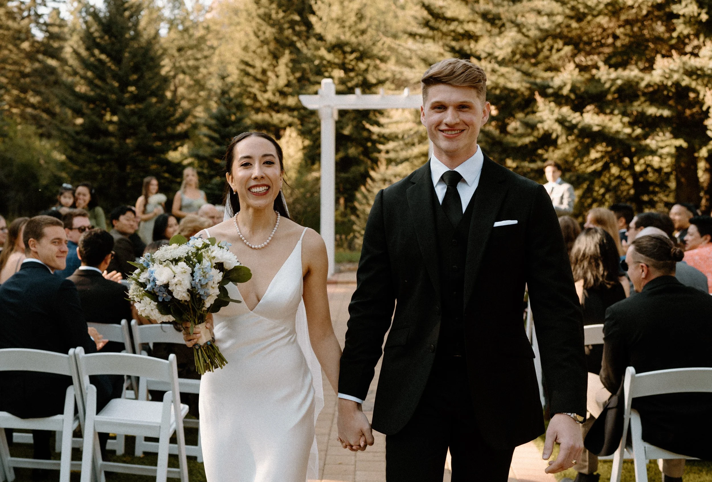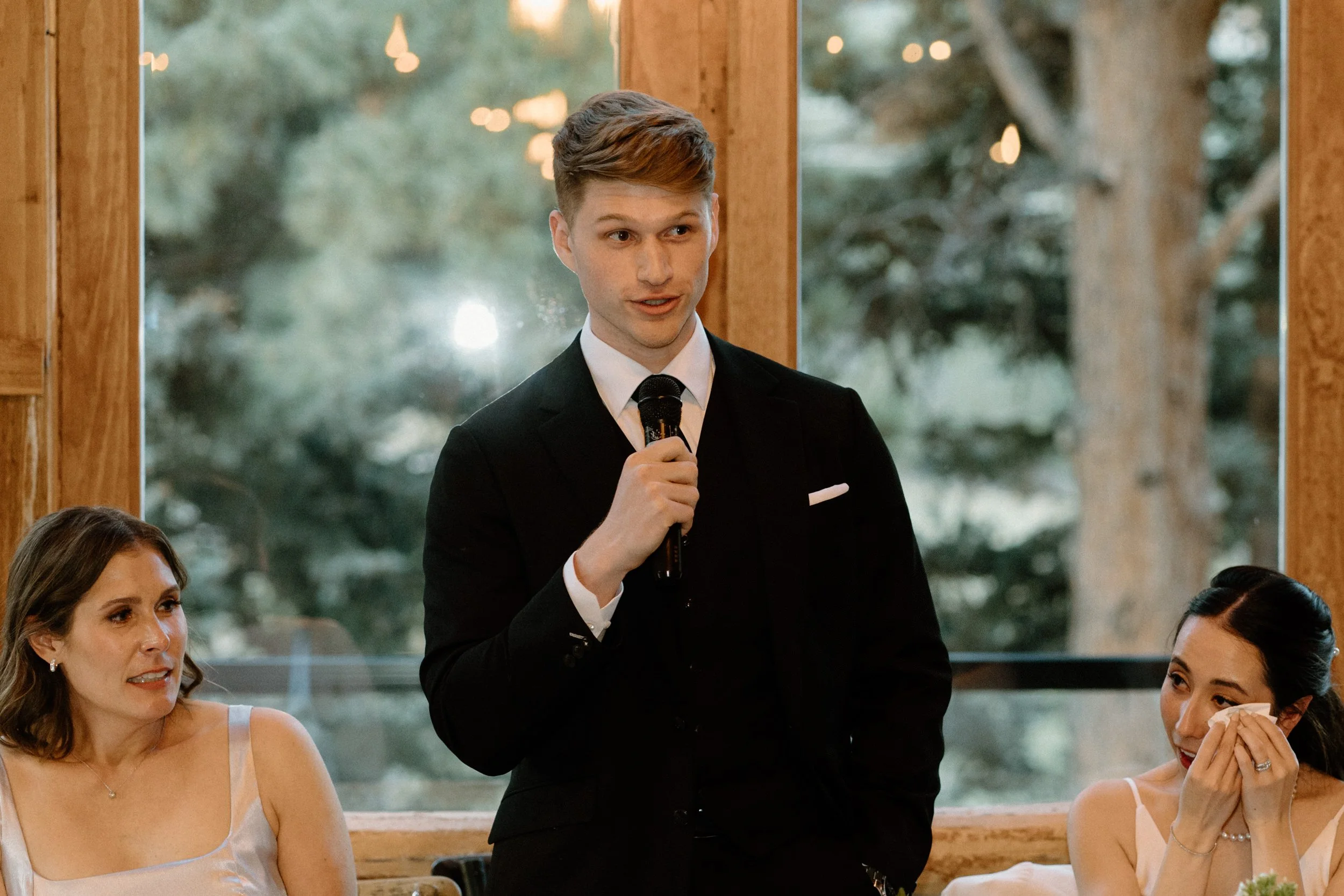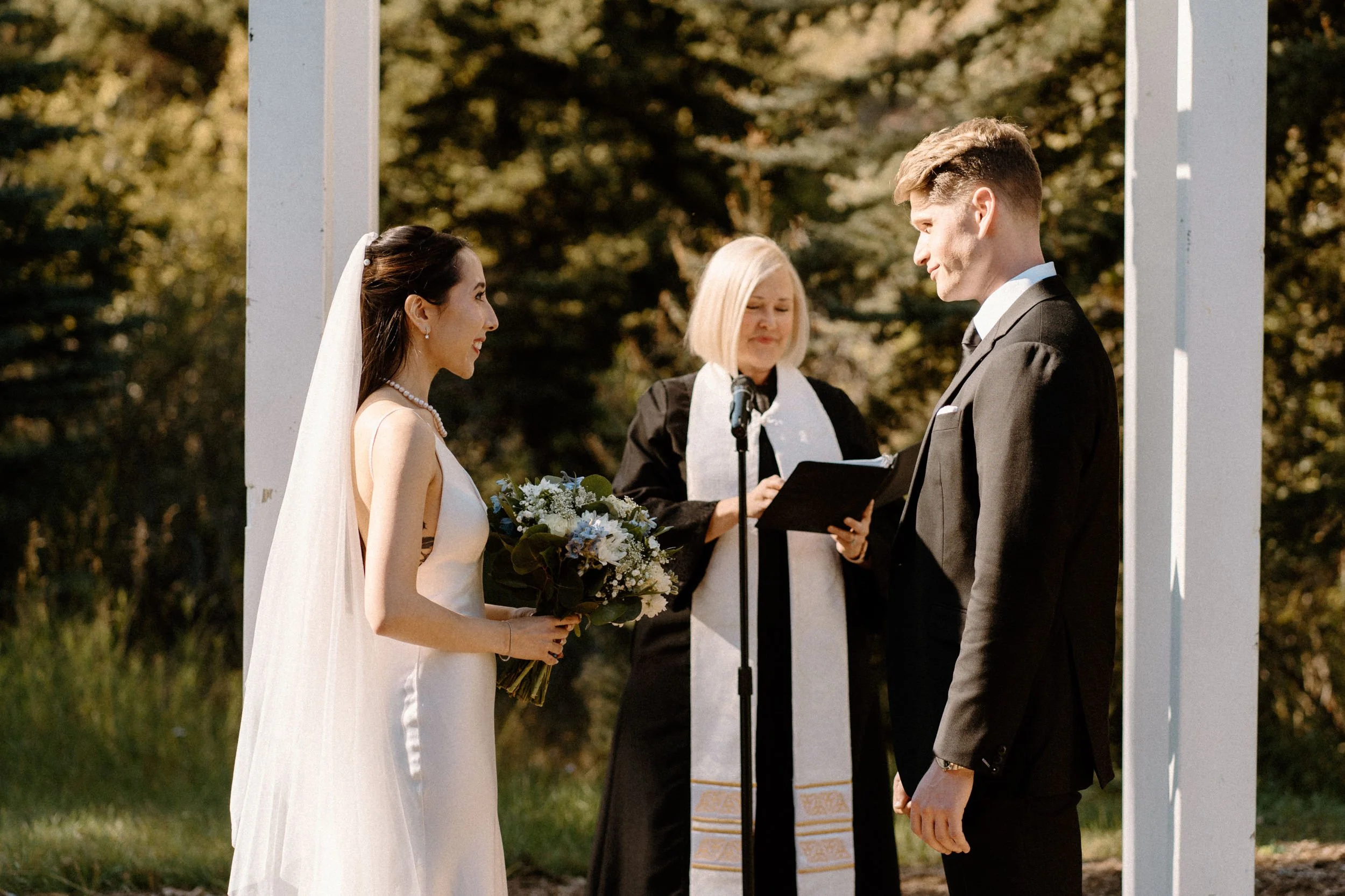 The ceremony took place surrounded by tall pines and mountain peaks, creating a stunning backdrop as Rachel and Gavin promised forever. There was a peacefulness to it all, the kind of wedding where you could feel how deeply connected everyone was. Every part of the day held meaning, from the custom signage to the florals that tied in their favorite colors and memories.
