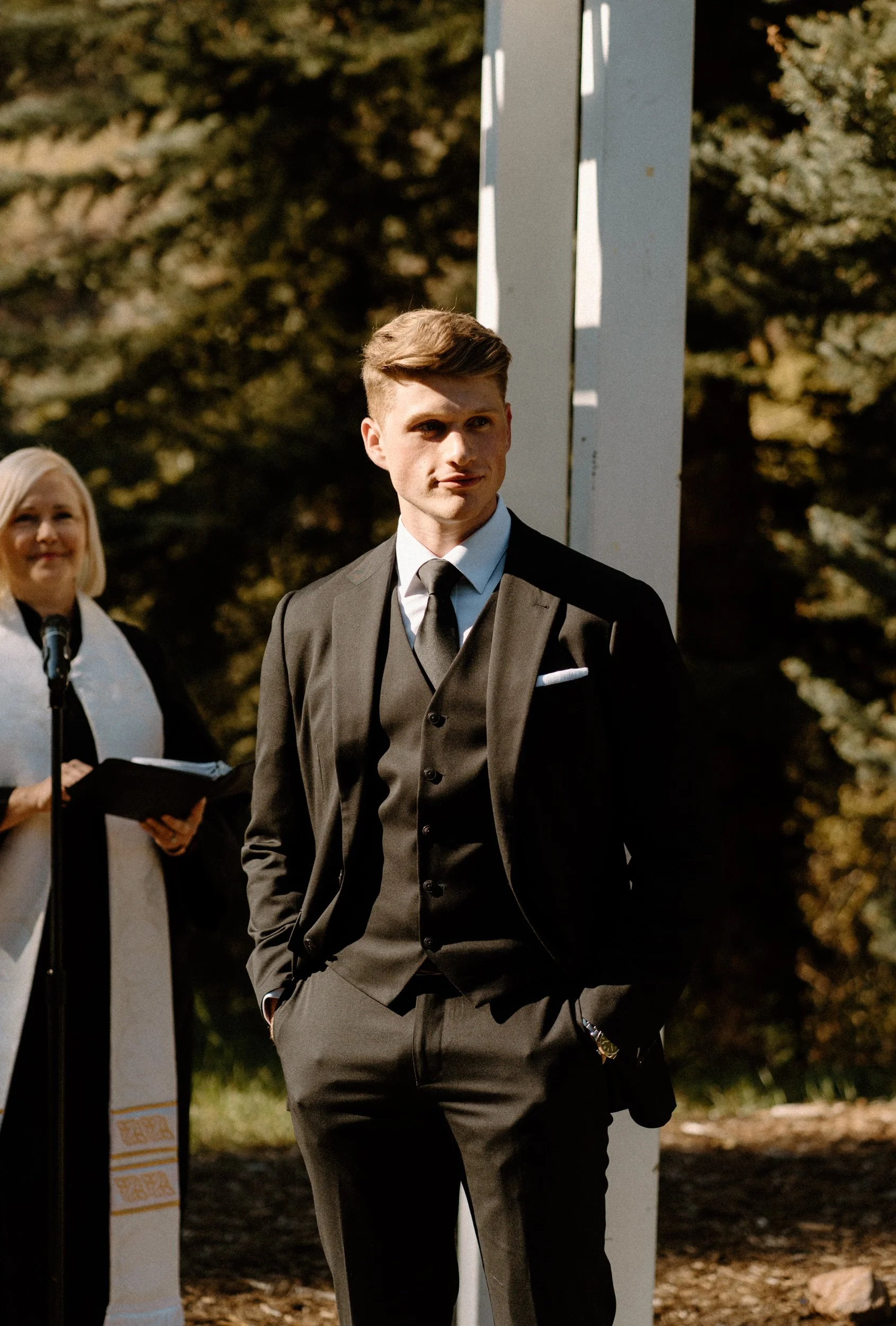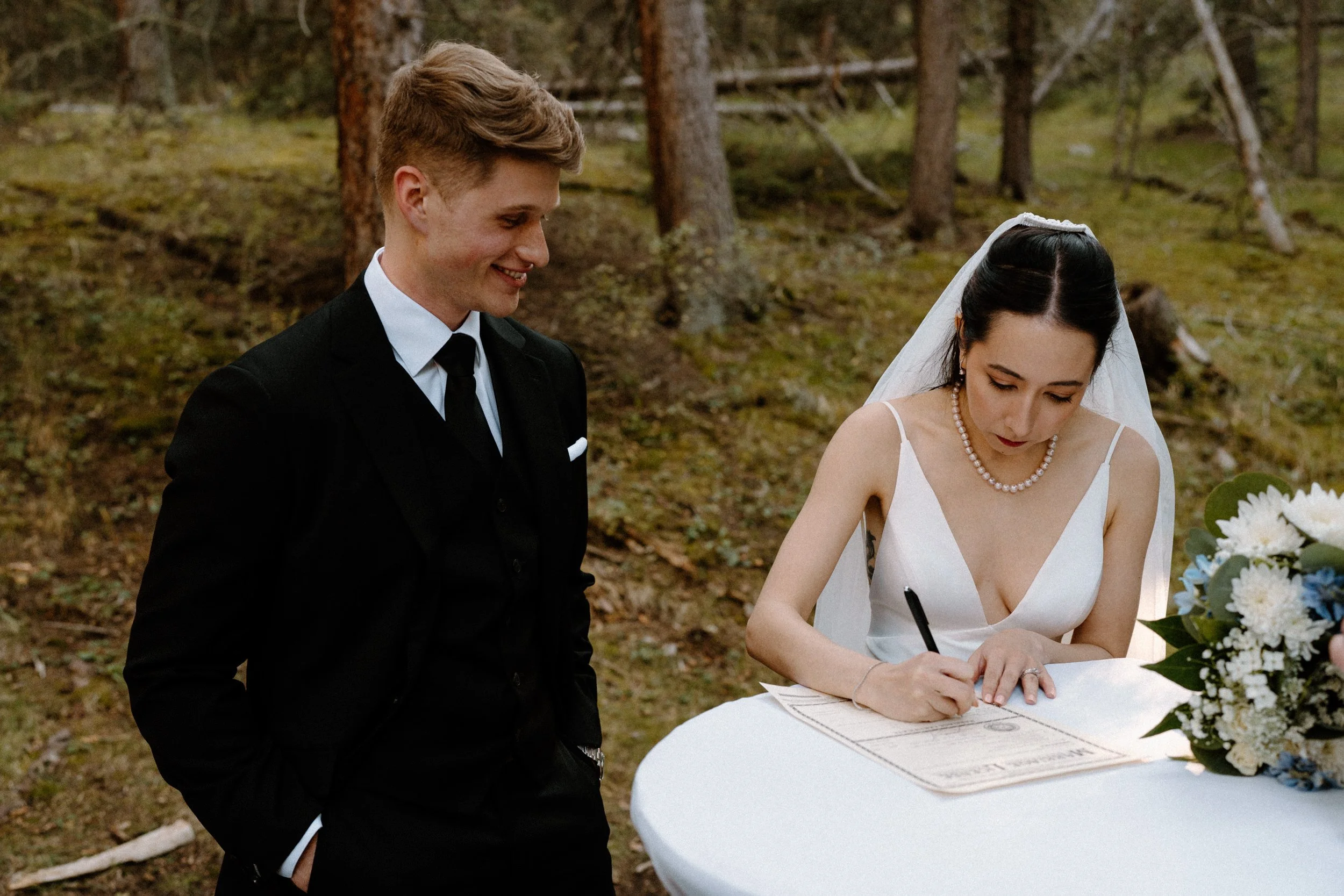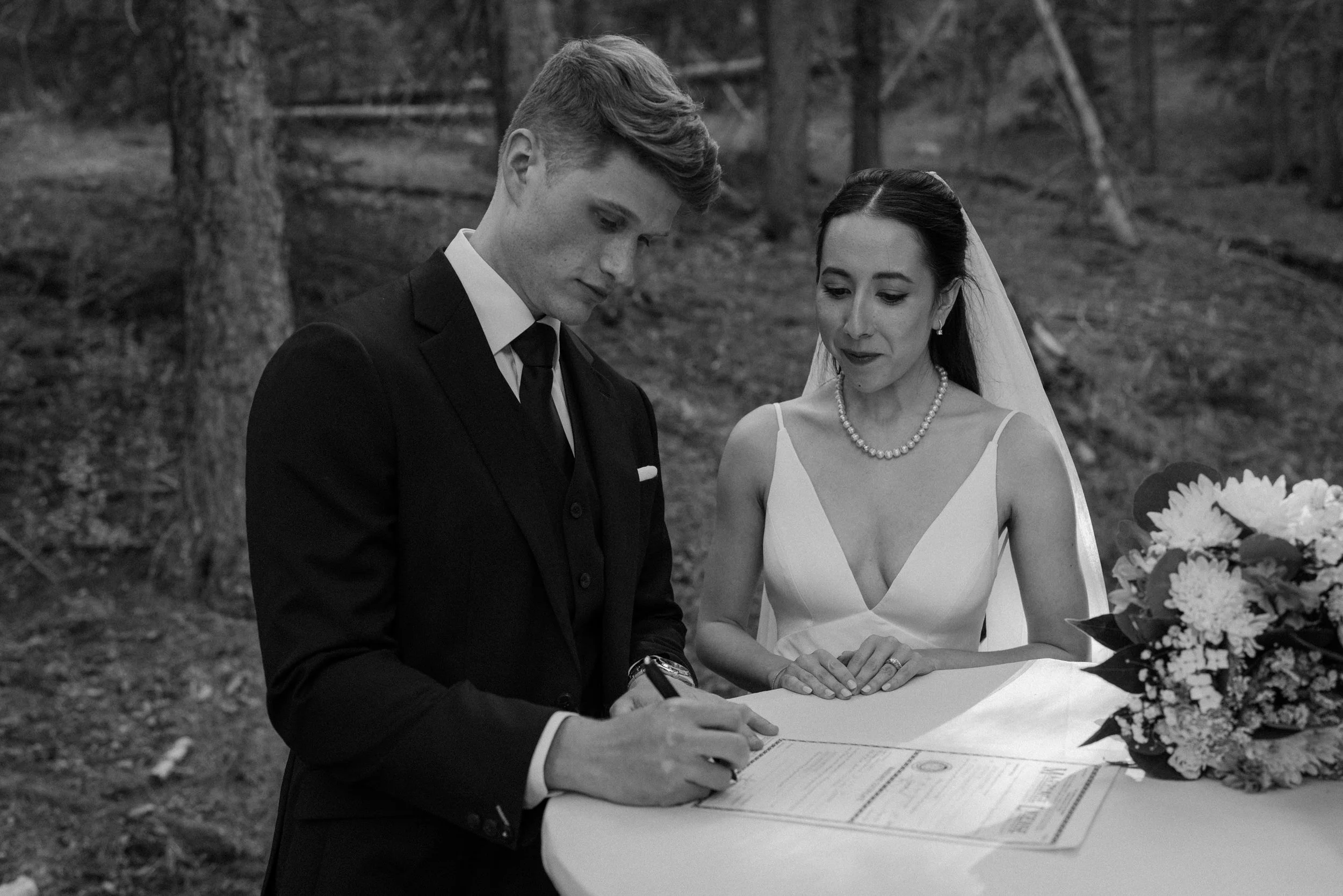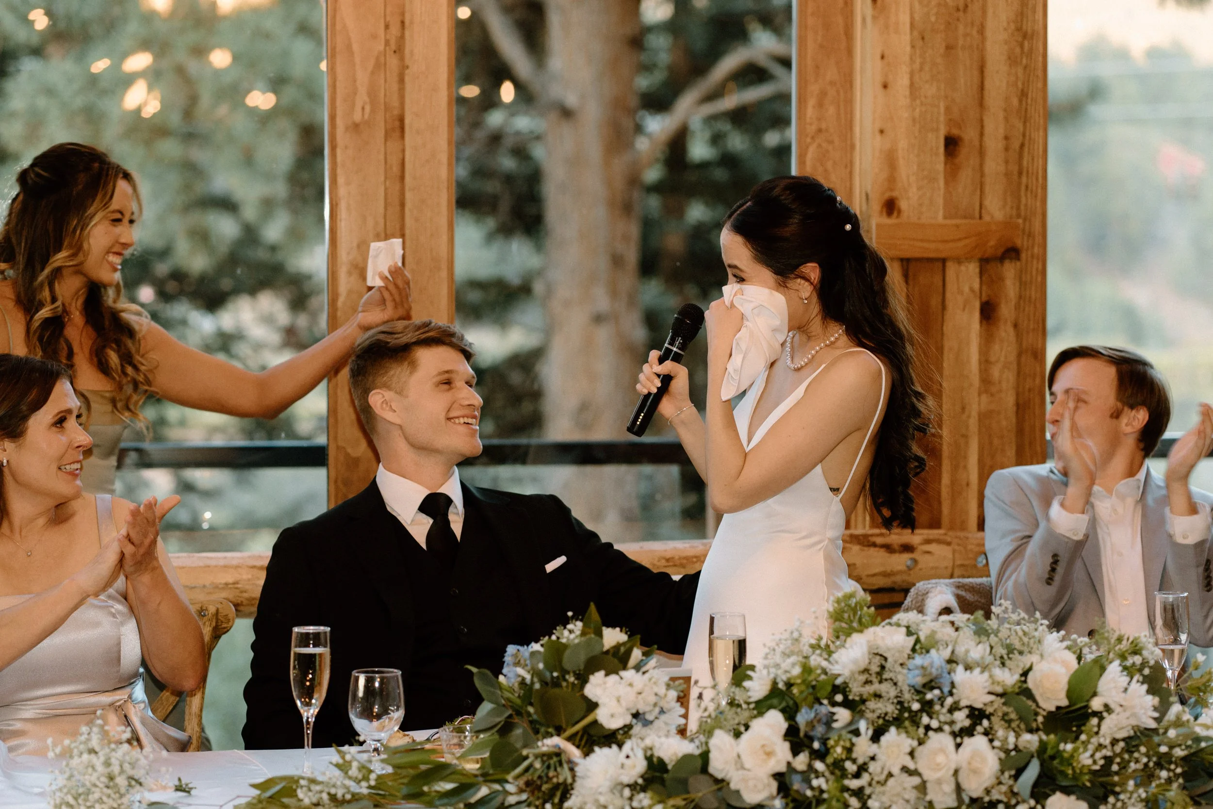The ceremony took place surrounded by tall pines and mountain peaks, creating a stunning backdrop as Rachel and Gavin promised forever. There was a peacefulness to it all, the kind of wedding where you could feel how deeply connected everyone was. Every part of the day held meaning, from the custom signage to the florals that tied in their favorite colors and memories.