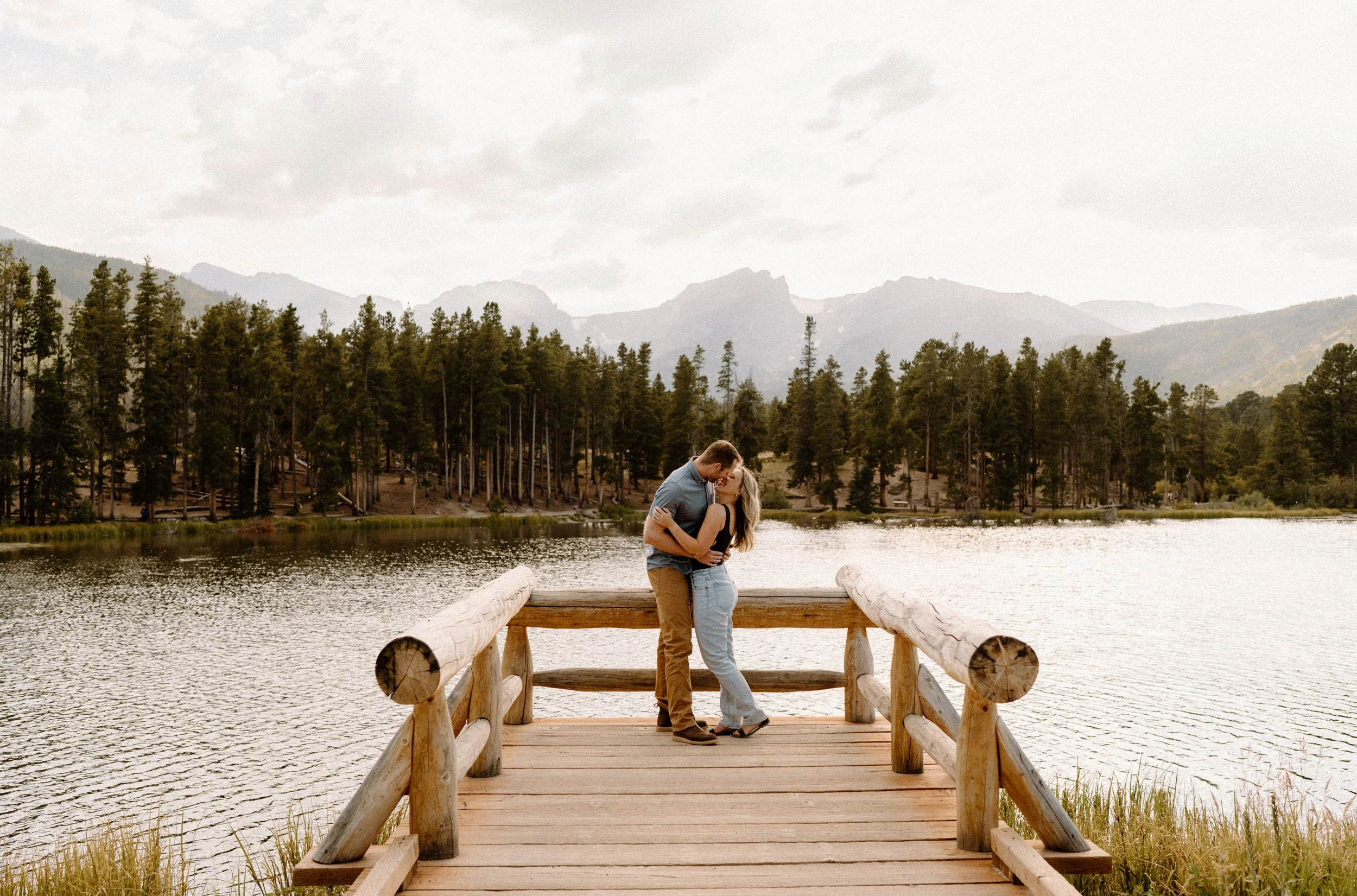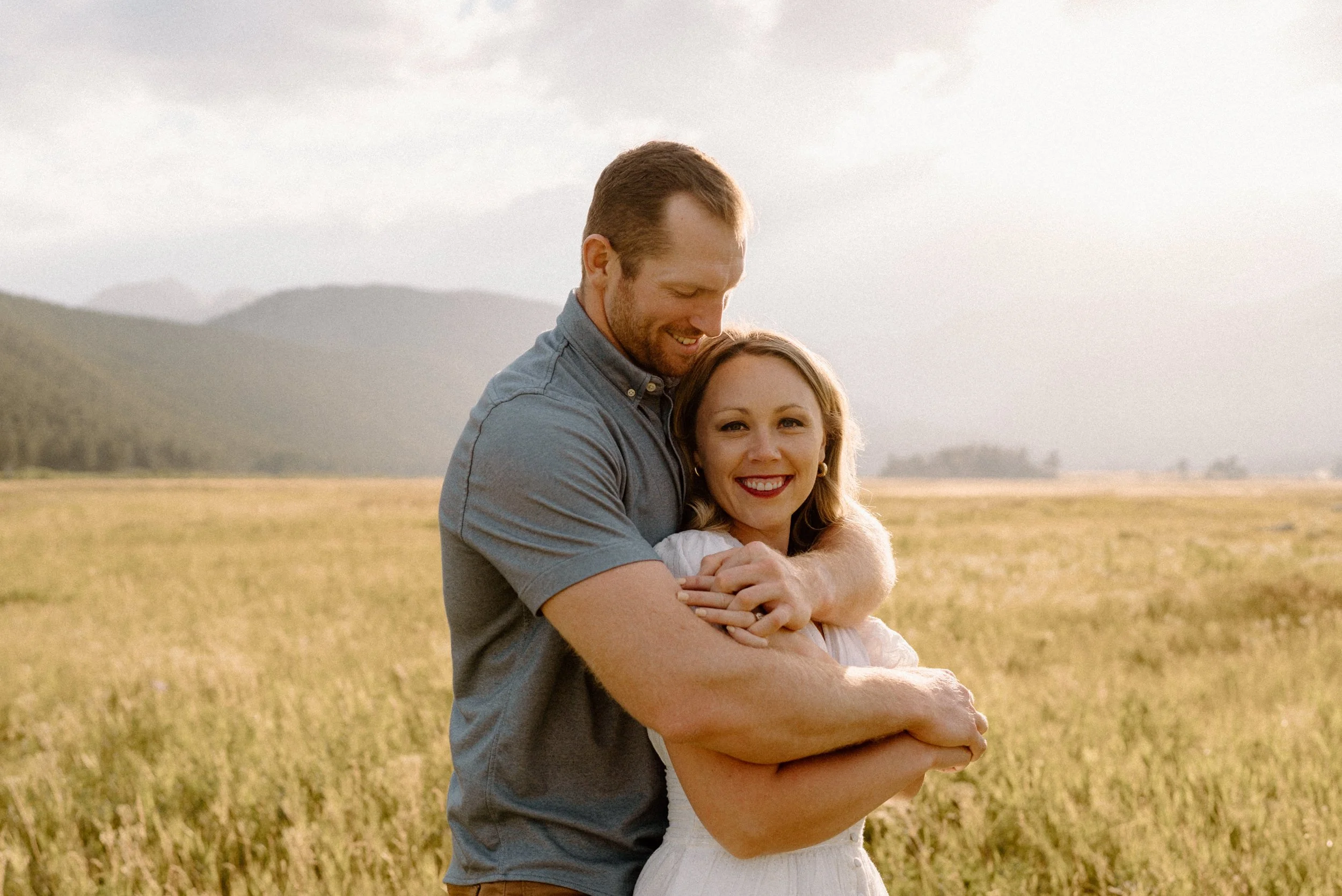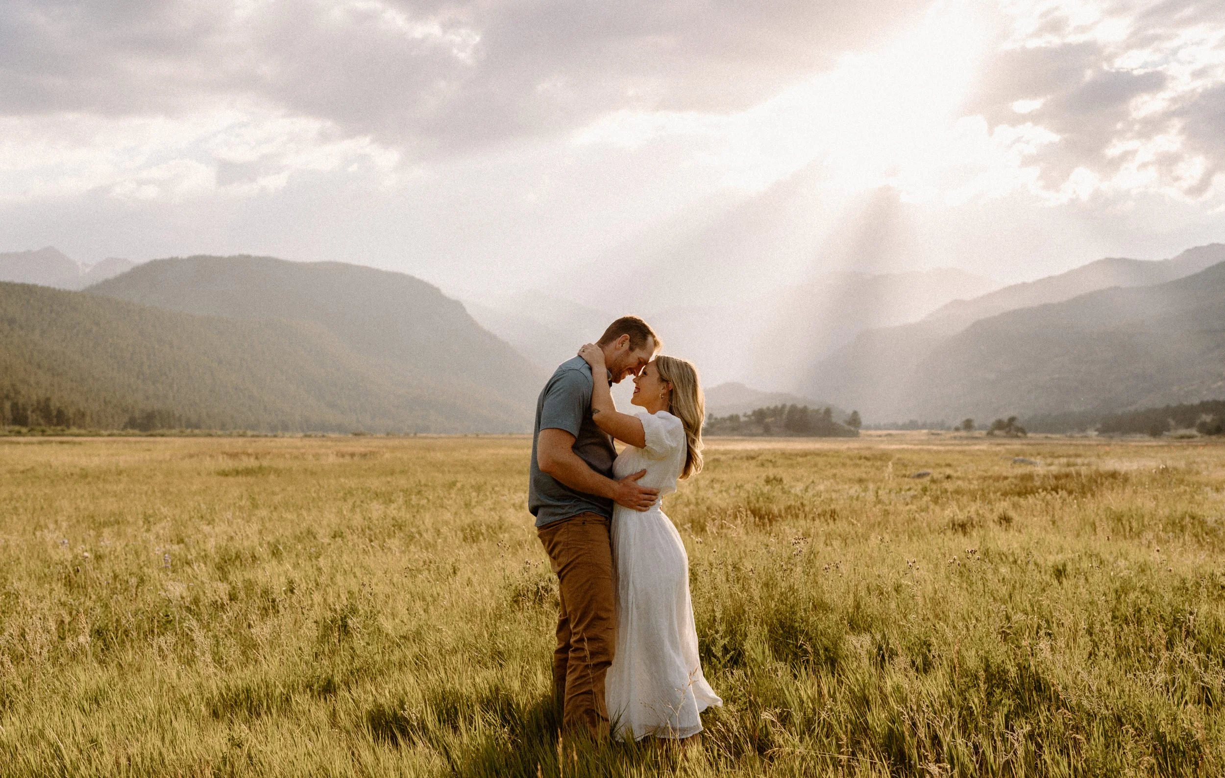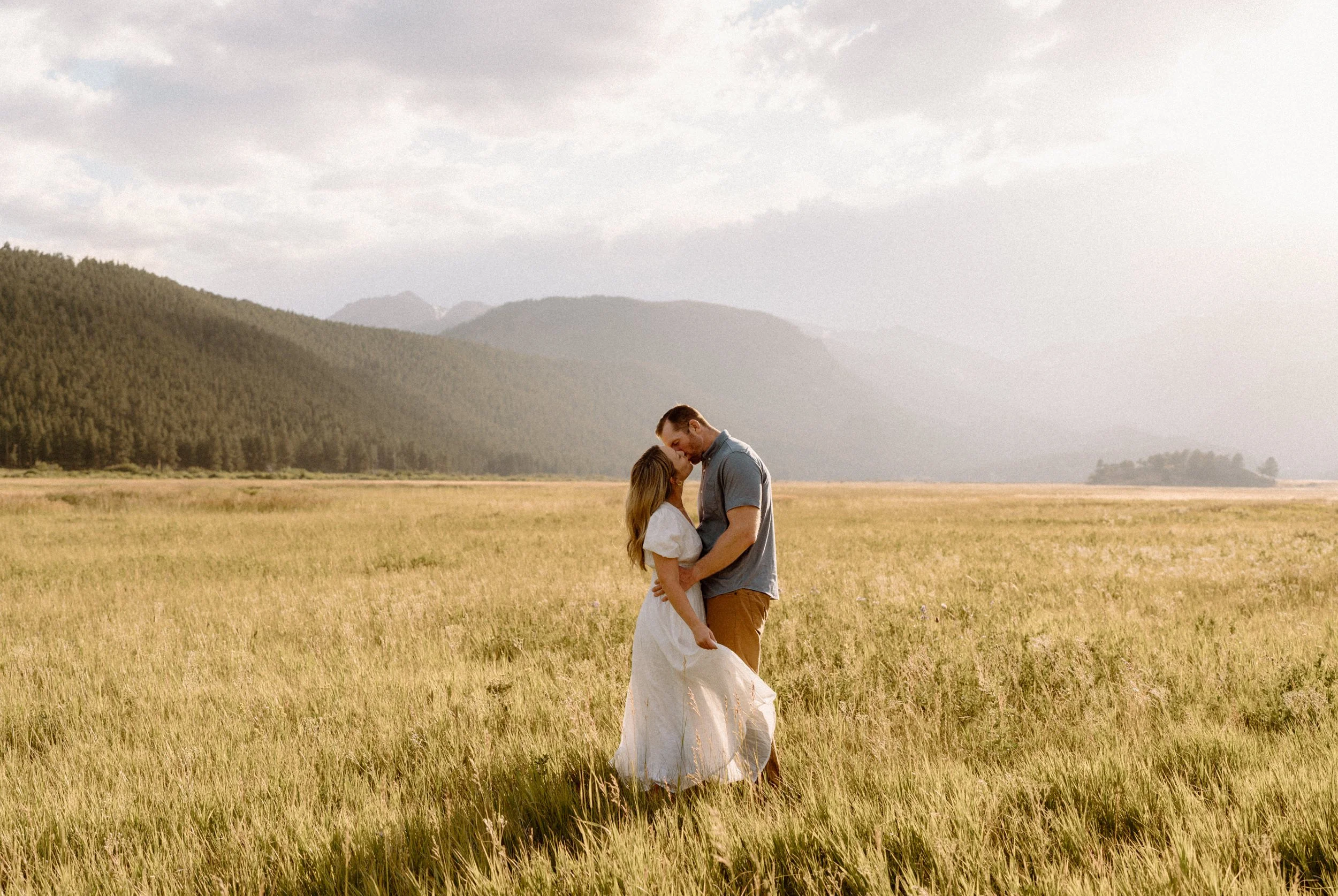 On the night of Hannah and Reid’s engagement session we started off with hiking the loop around Sprague Lake. It was such a beautiful summer evening! After we finished there, we swung by Moraine Park to catch the rest of Golden Hour! There was a lot of overcast and we thought we might get rained out, but the sun came through the dark clouds just in time! It was soooooo beautiful and incredible!