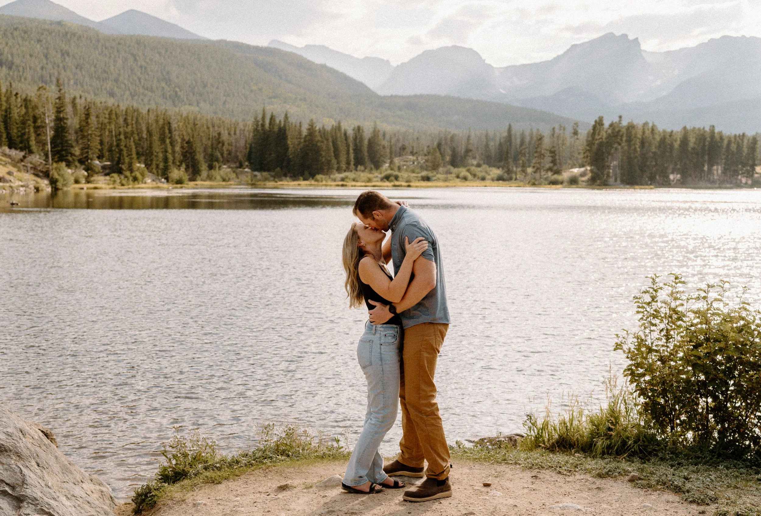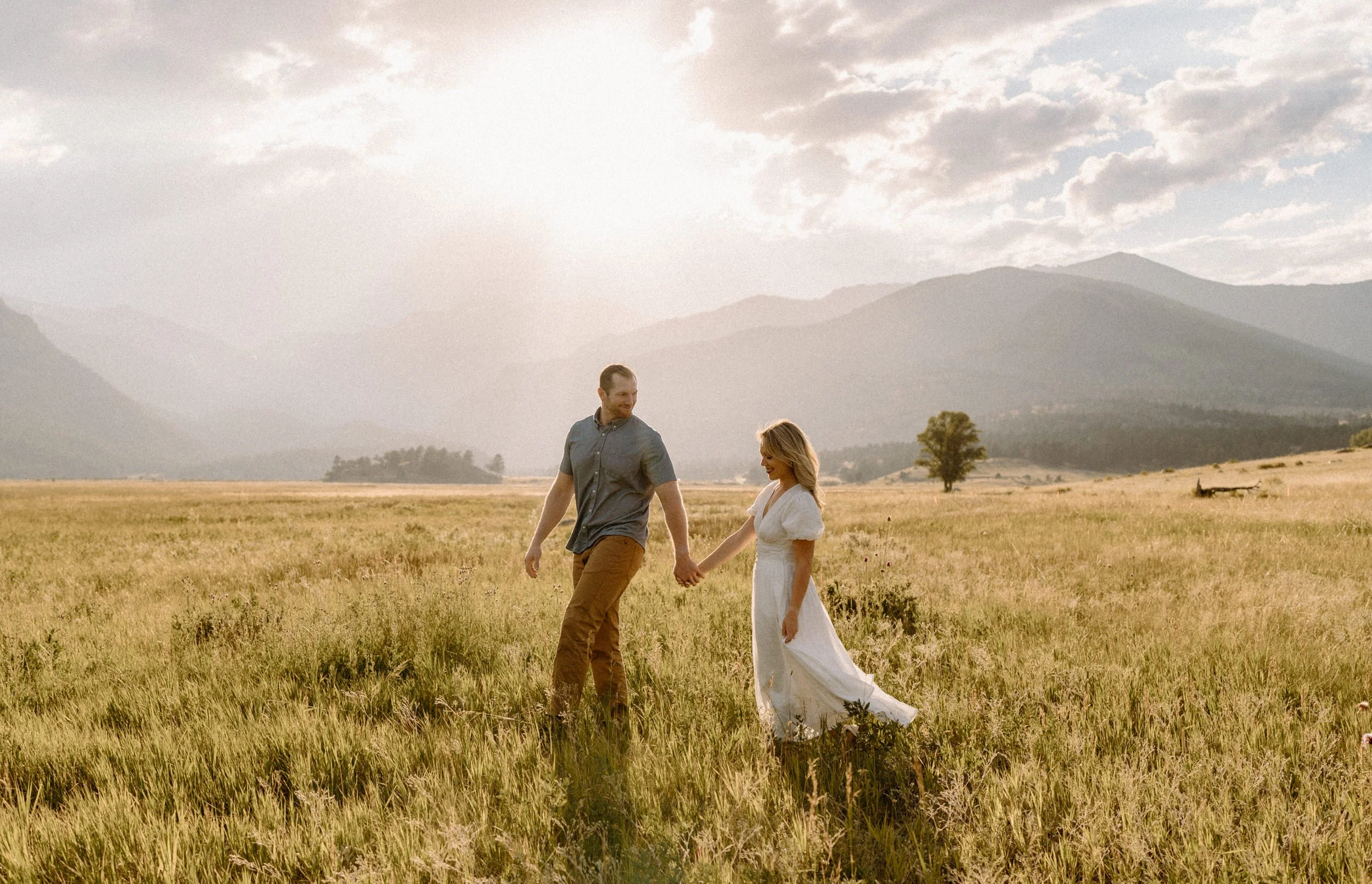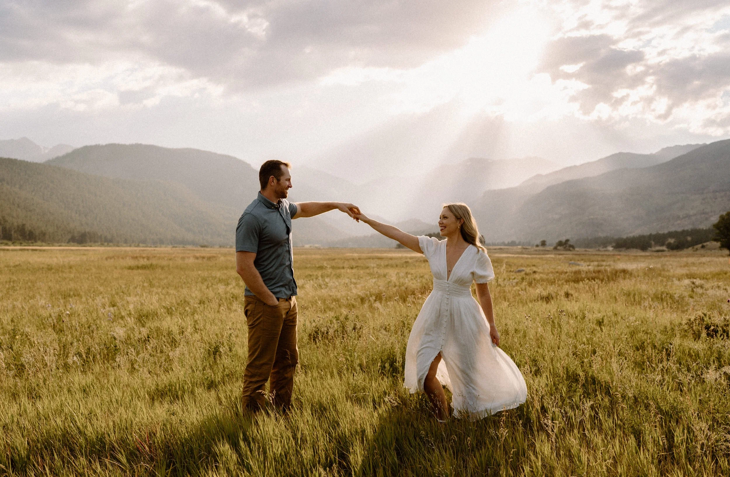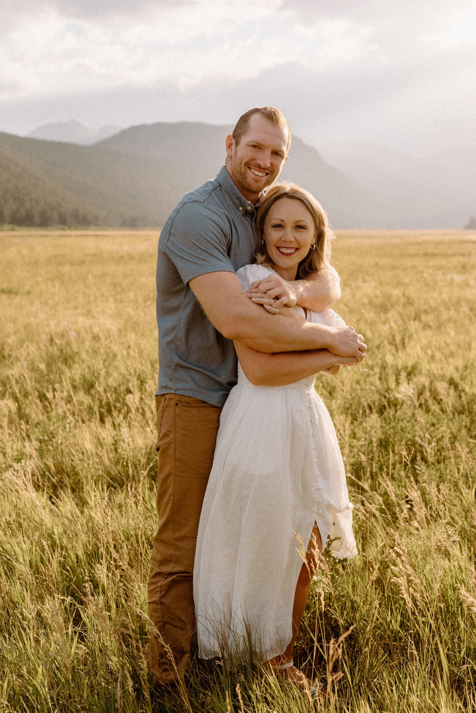 On the night of Hannah and Reid’s engagement session we started off with hiking the loop around Sprague Lake. It was such a beautiful summer evening! After we finished there, we swung by Moraine Park to catch the rest of Golden Hour! There was a lot of overcast and we thought we might get rained out, but the sun came through the dark clouds just in time! It was soooooo beautiful and incredible!