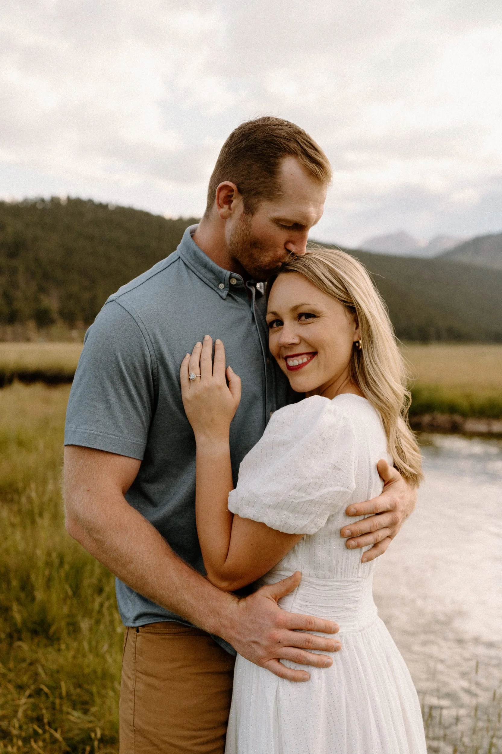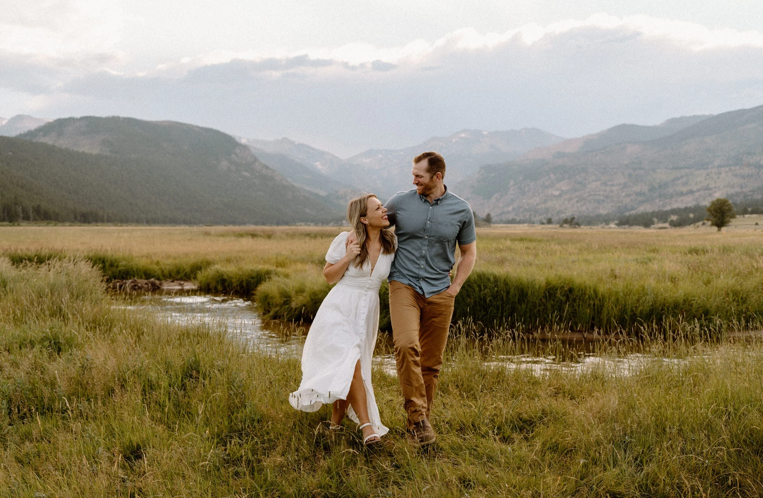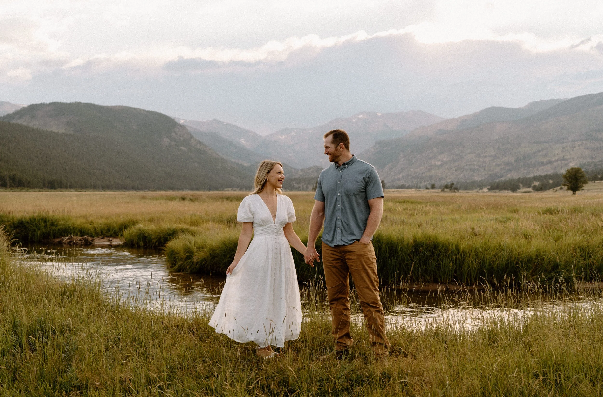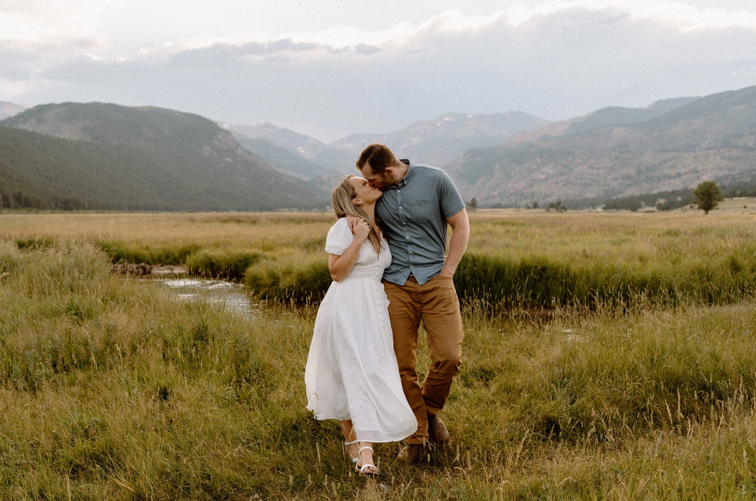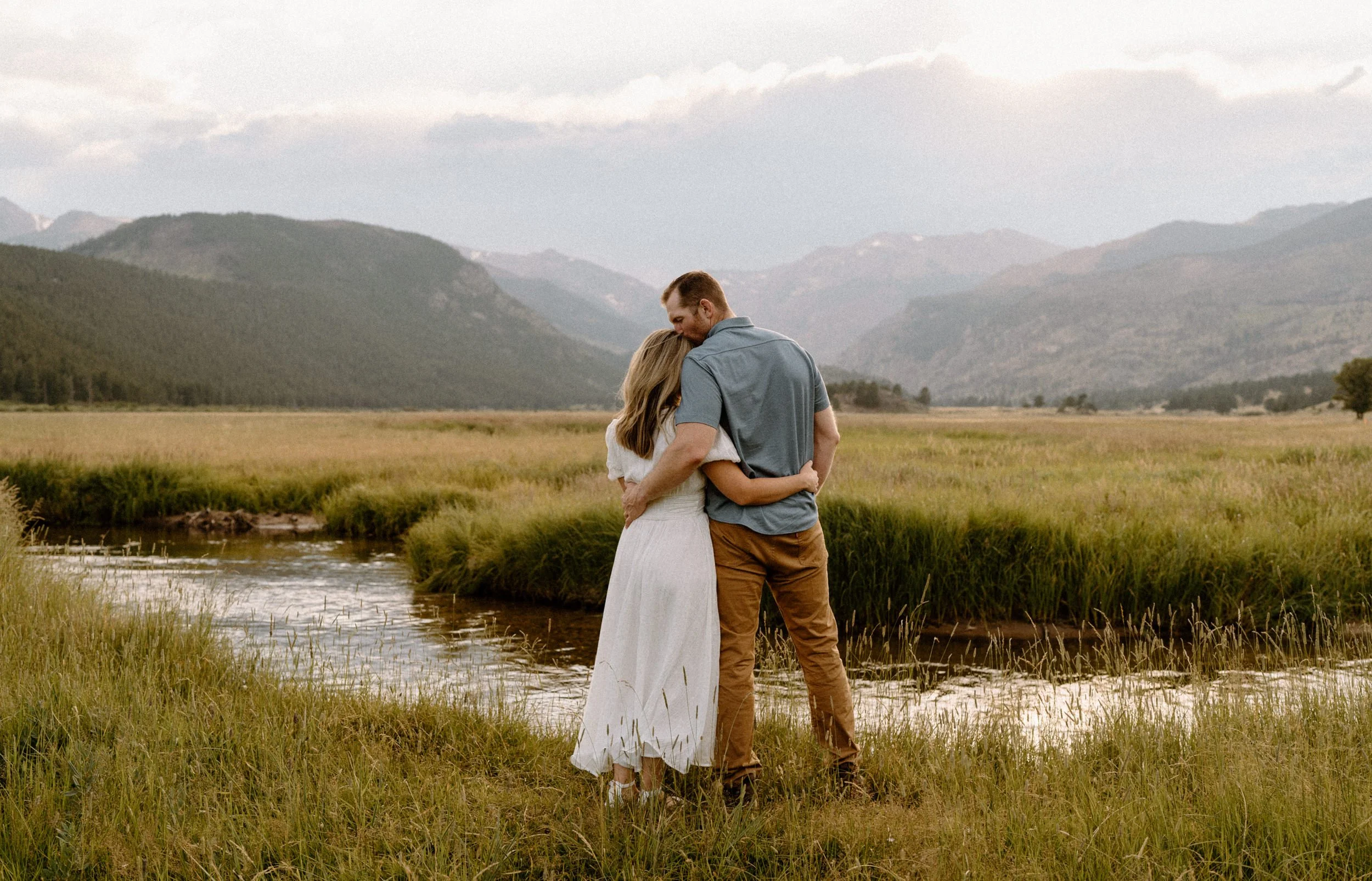On the night of Hannah and Reid’s engagement session we started off with hiking the loop around Sprague Lake. It was such a beautiful summer evening! After we finished there, we swung by Moraine Park to catch the rest of Golden Hour! There was a lot of overcast and we thought we might get rained out, but the sun came through the dark clouds just in time! It was soooooo beautiful and incredible!