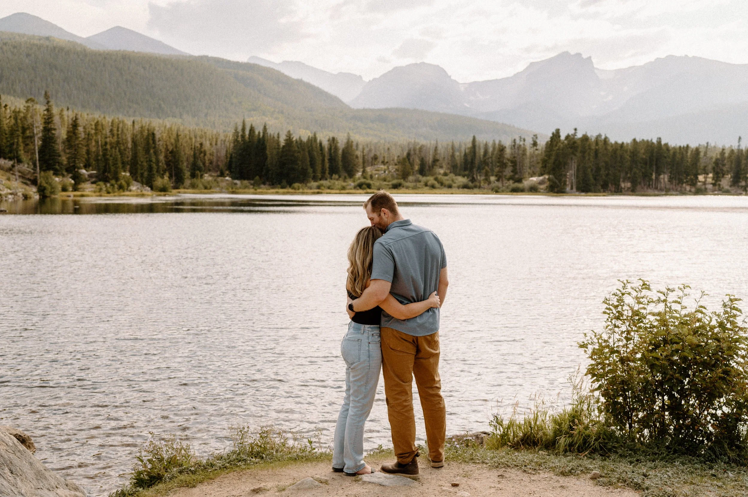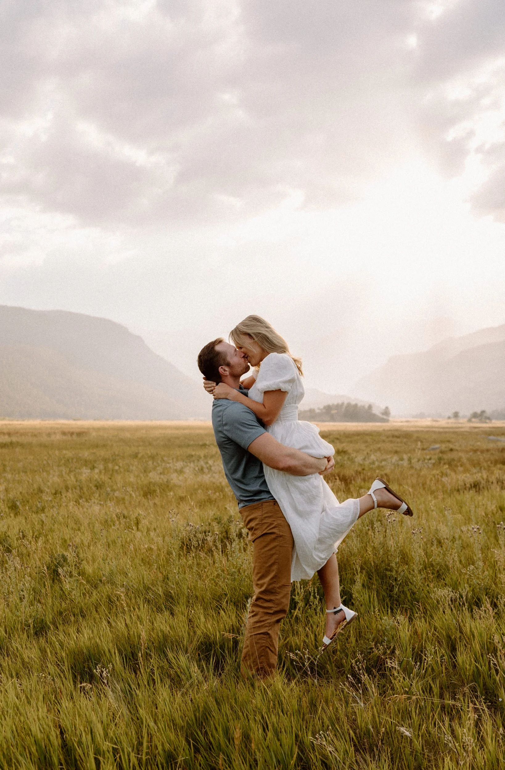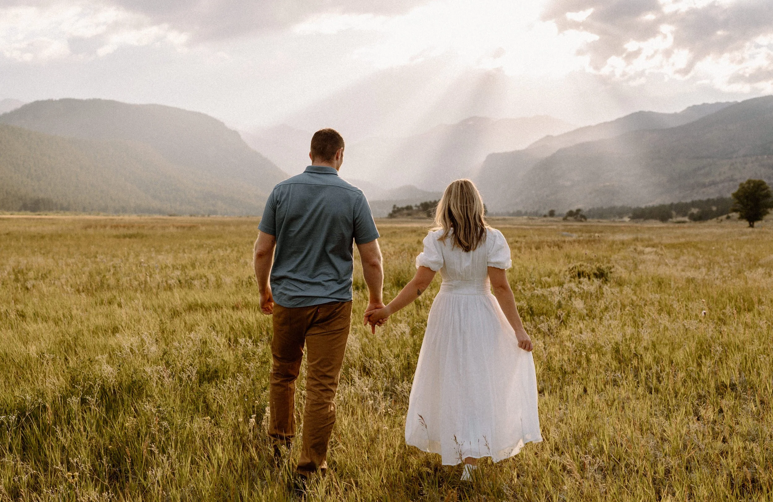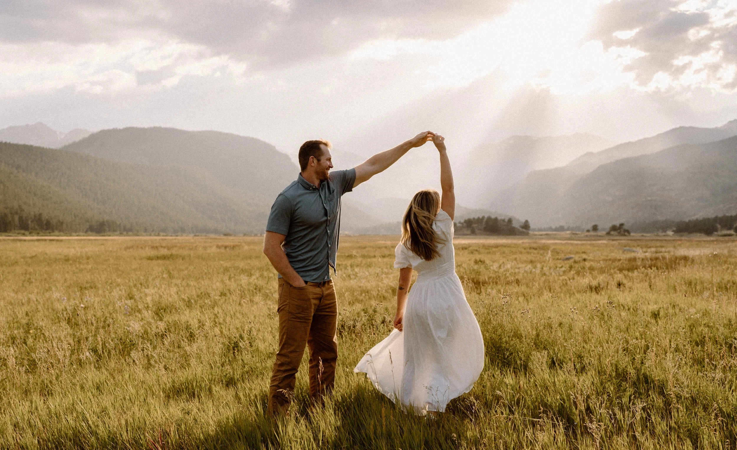 On the night of Hannah and Reid’s engagement session we started off with hiking the loop around Sprague Lake. It was such a beautiful summer evening! After we finished there, we swung by Moraine Park to catch the rest of Golden Hour! There was a lot of overcast and we thought we might get rained out, but the sun came through the dark clouds just in time! It was soooooo beautiful and incredible!