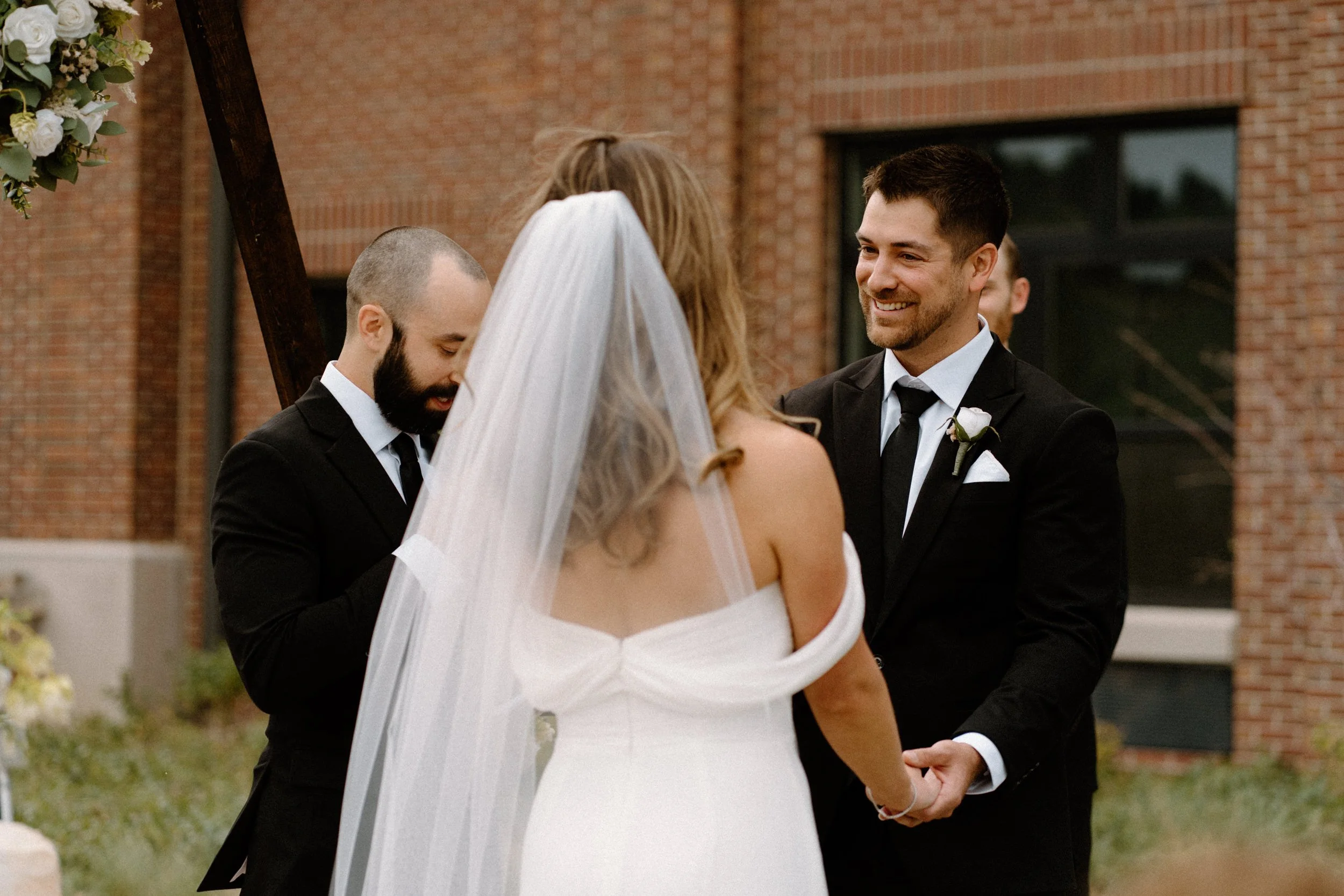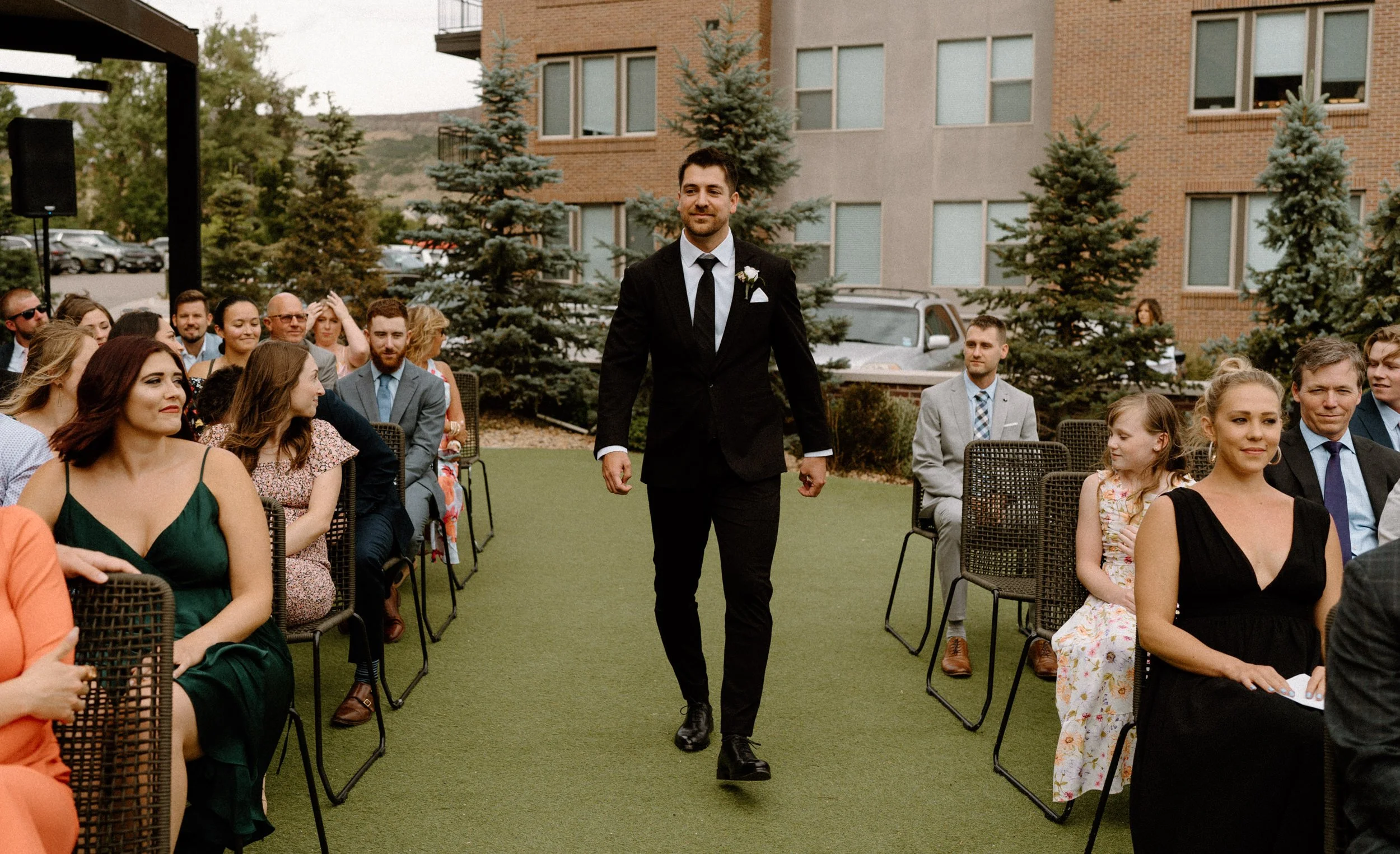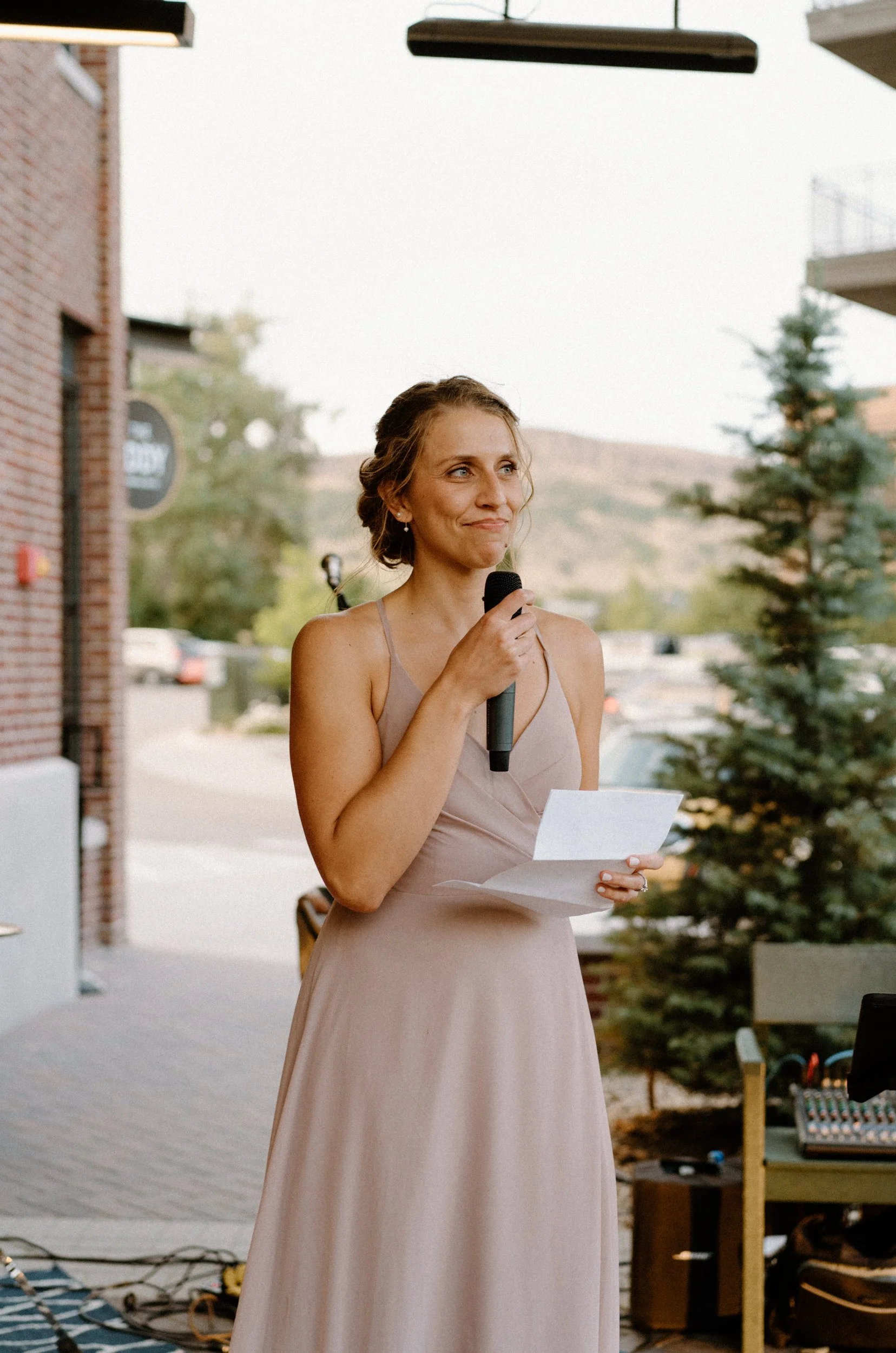 The ceremony took place on the rooftop with views of the foothills and that golden Colorado light pouring in. Compass Rose Floral absolutely nailed the florals!! Soft blush tones, wild greenery, and the most romantic bouquet I’ve ever seen. It felt like a Pinterest board come to life.