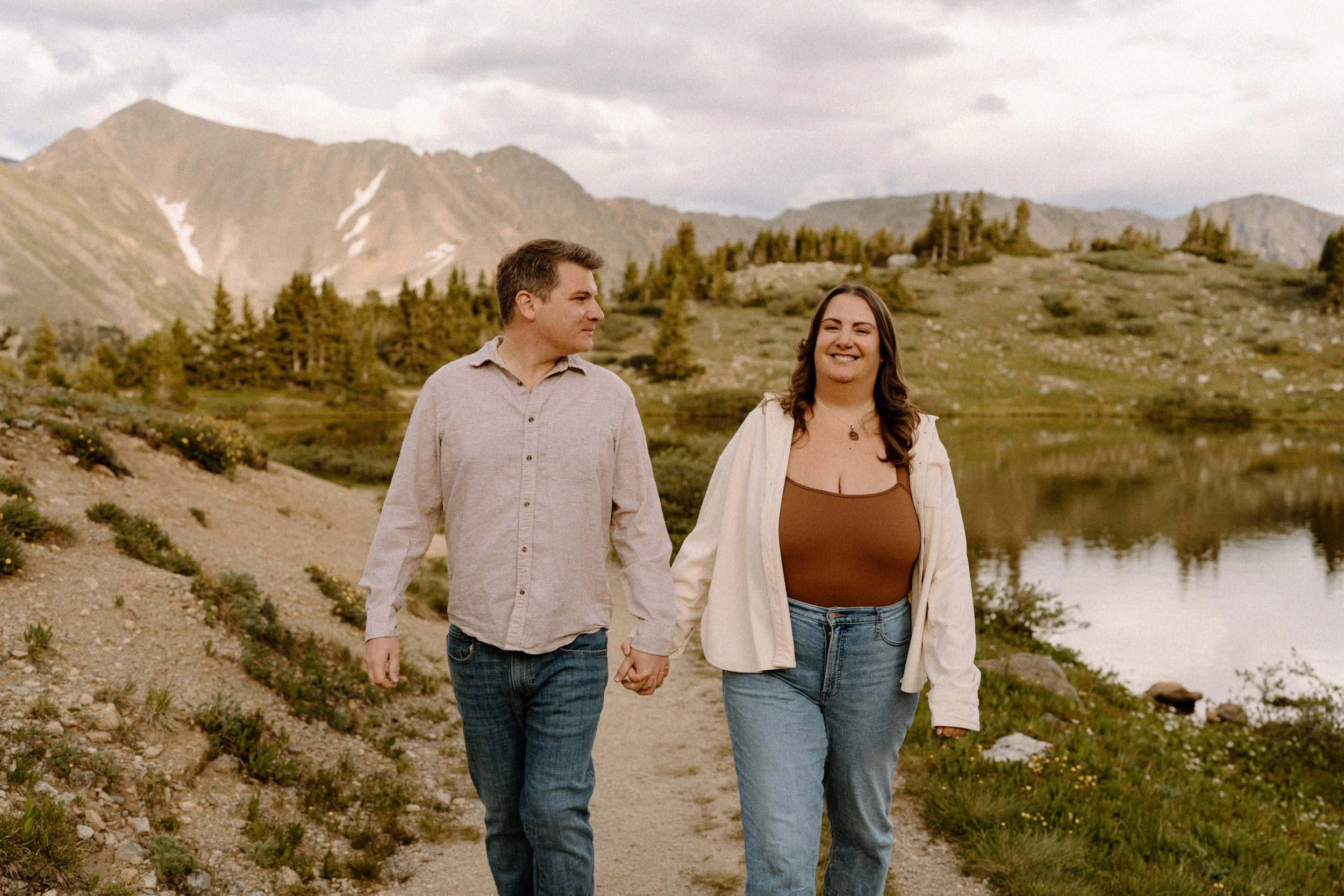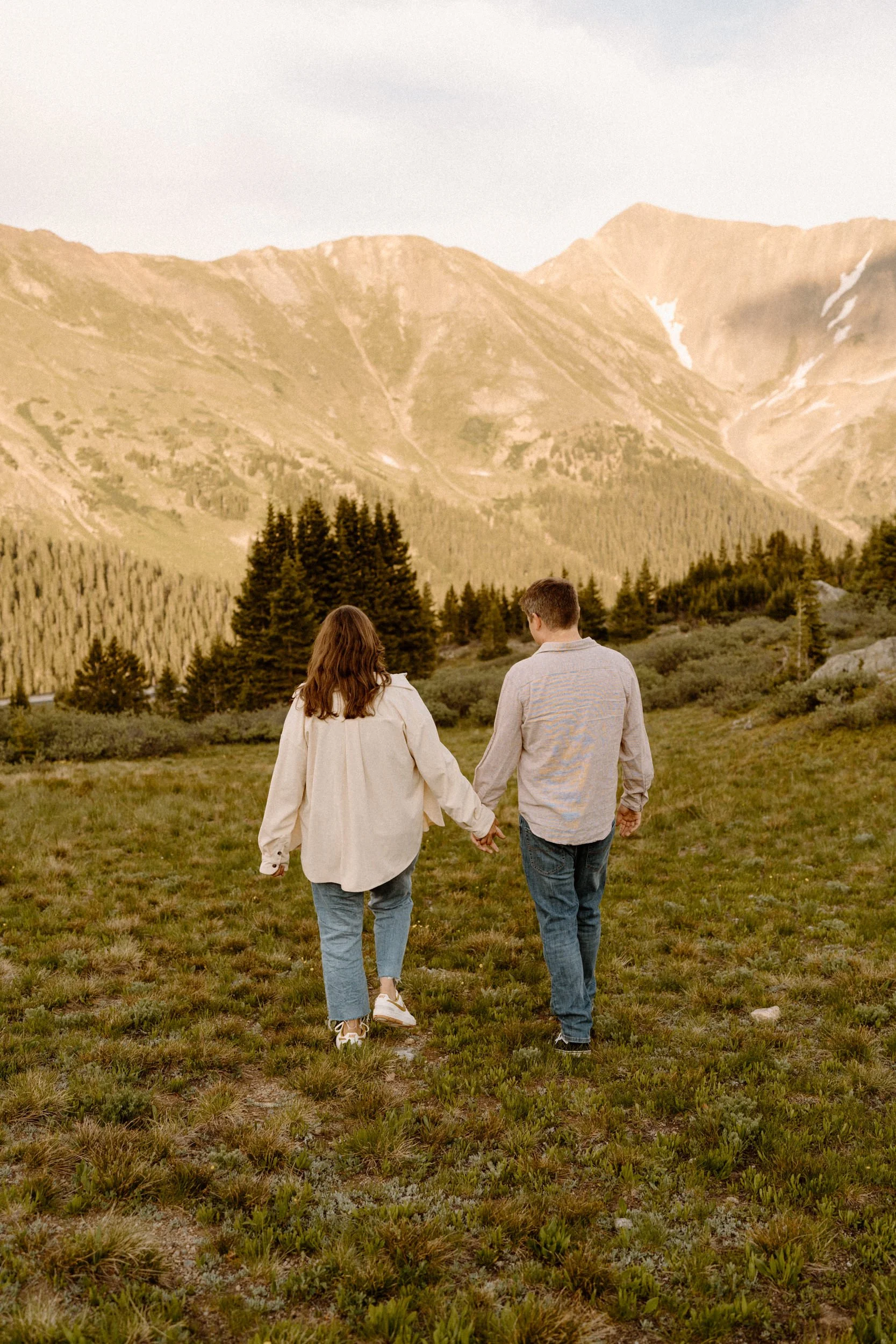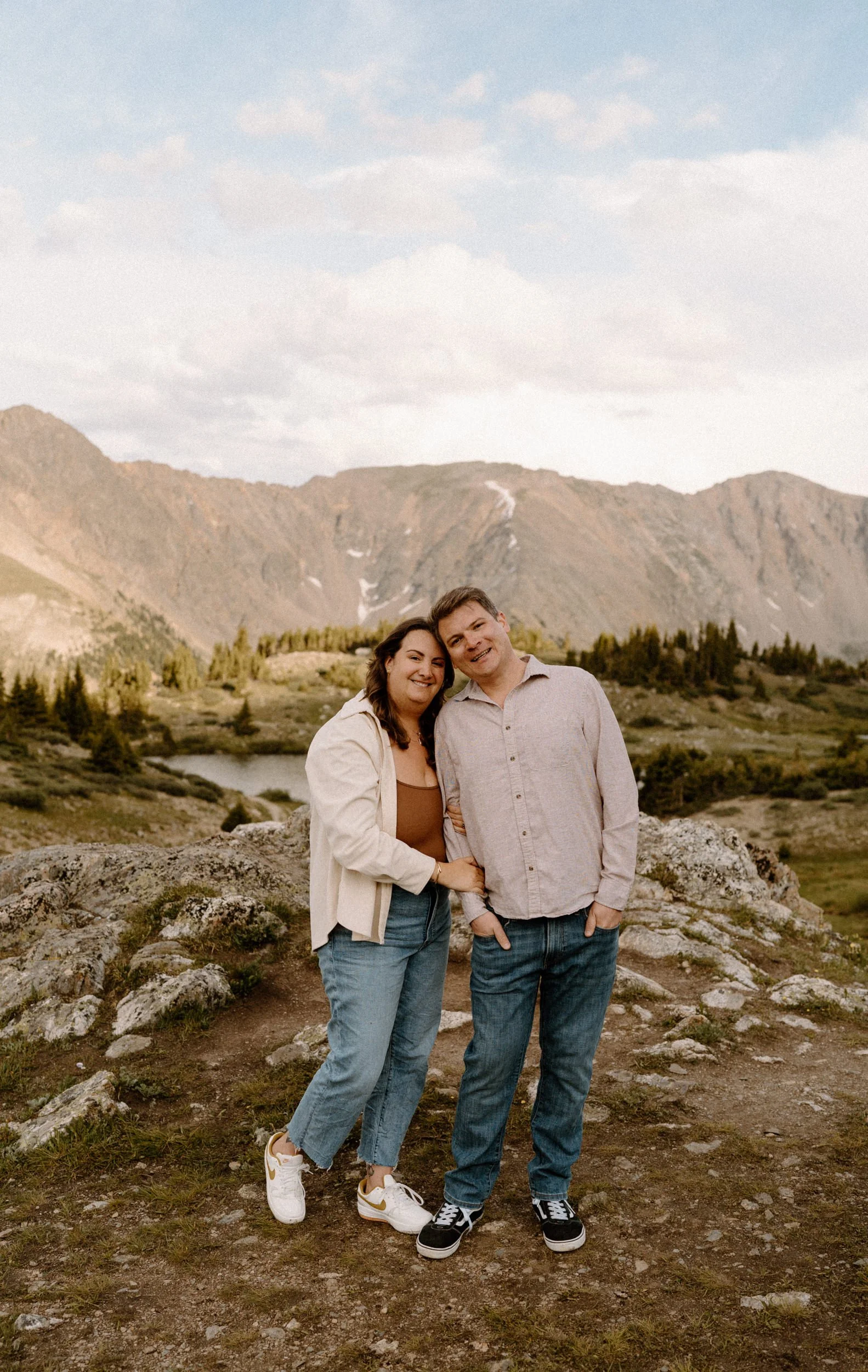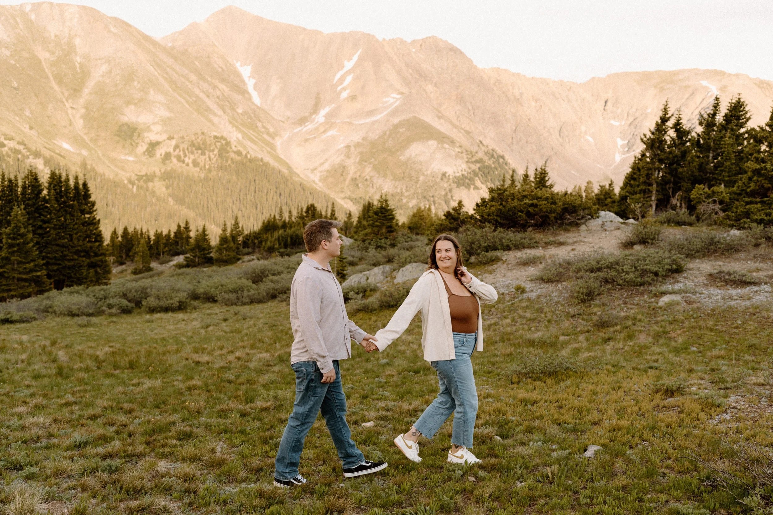 We met up just before golden hour, and the weather was classic Colorado. A little unpredictable, a little dramatic, and totally stunning. Brooke showed up in a cozy neutral-toned cardigan and sneakers that were cute and practical, while Grant kept it simple in denim and layers. They weren’t trying to be anything but themselves, and that made the whole shoot feel effortless.