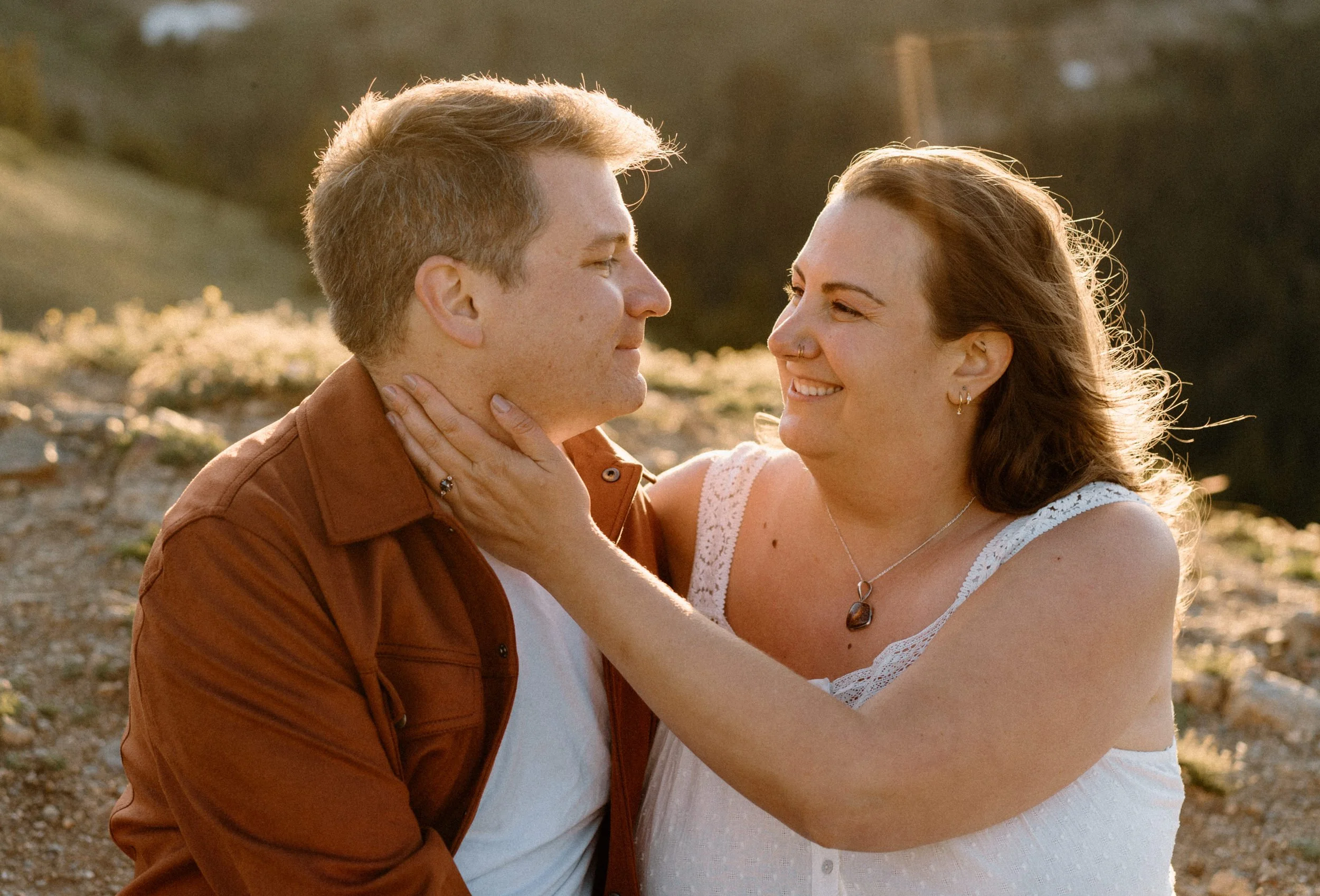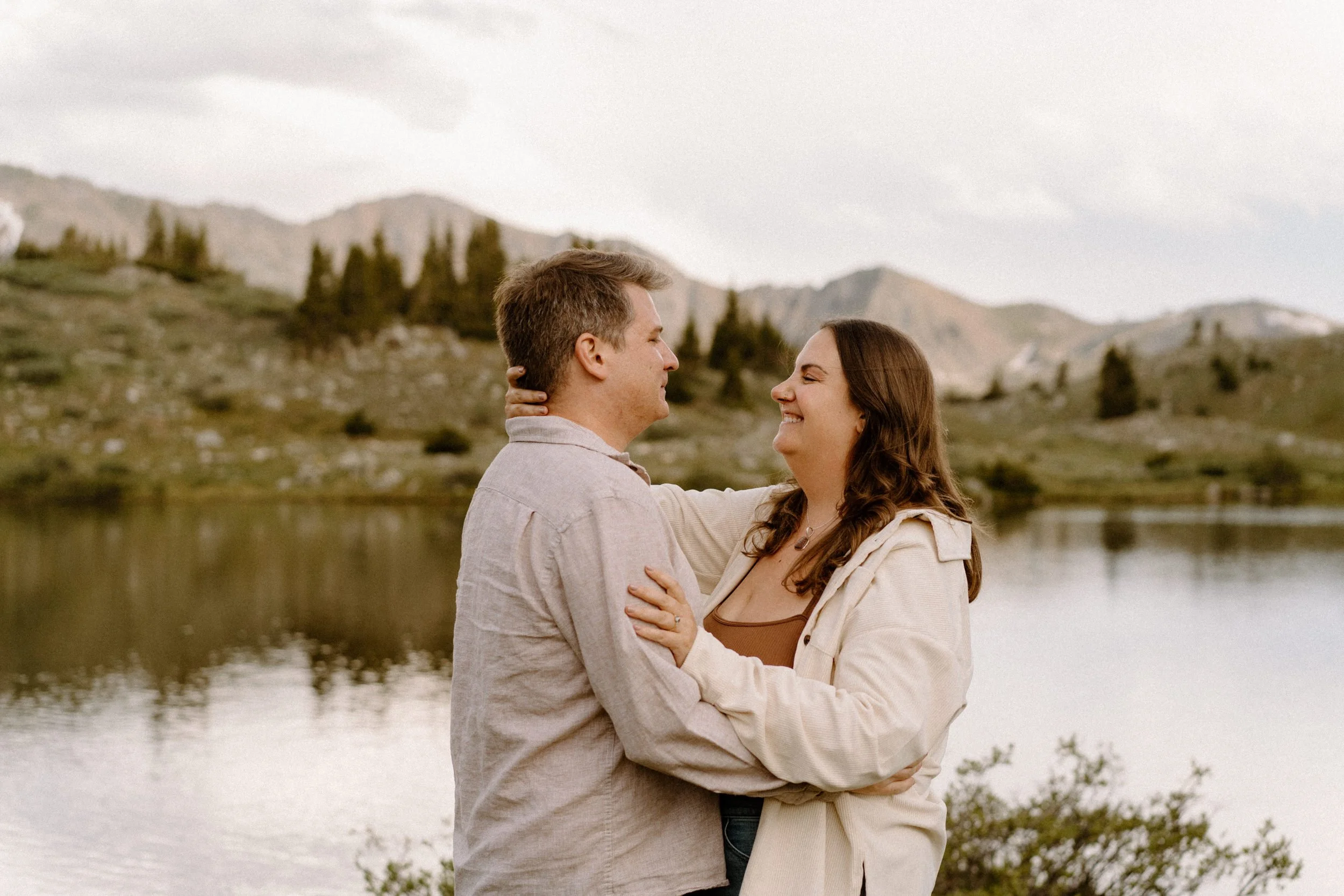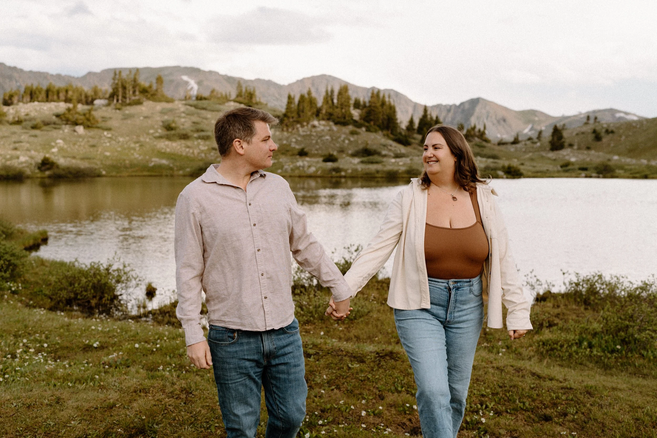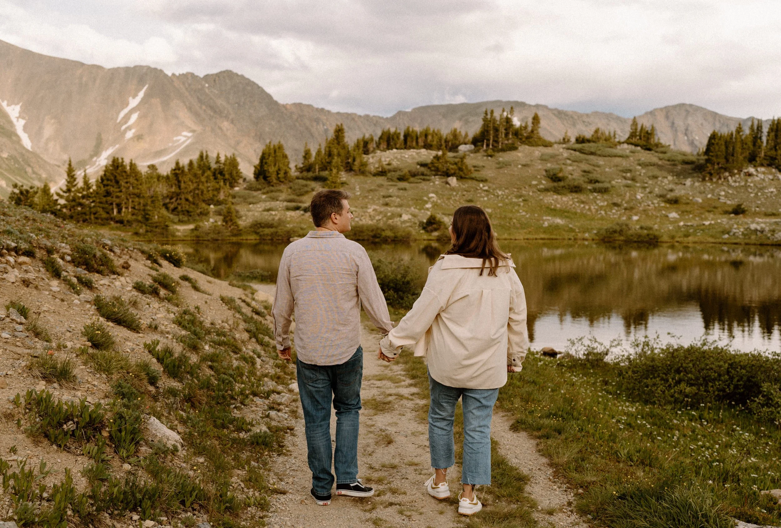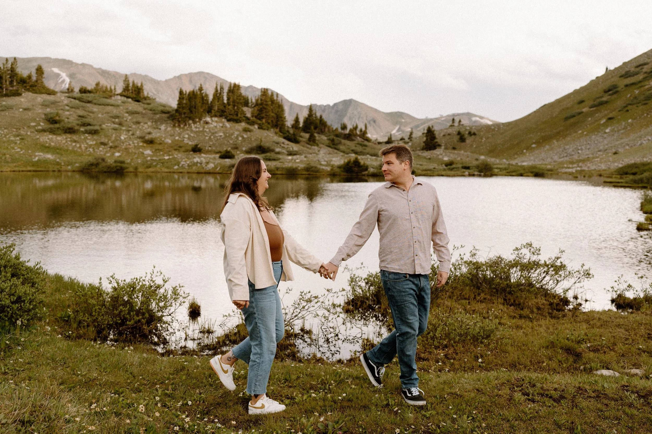 We met up just before golden hour, and the weather was classic Colorado. A little unpredictable, a little dramatic, and totally stunning. Brooke showed up in a cozy neutral-toned cardigan and sneakers that were cute and practical, while Grant kept it simple in denim and layers. They weren’t trying to be anything but themselves, and that made the whole shoot feel effortless.